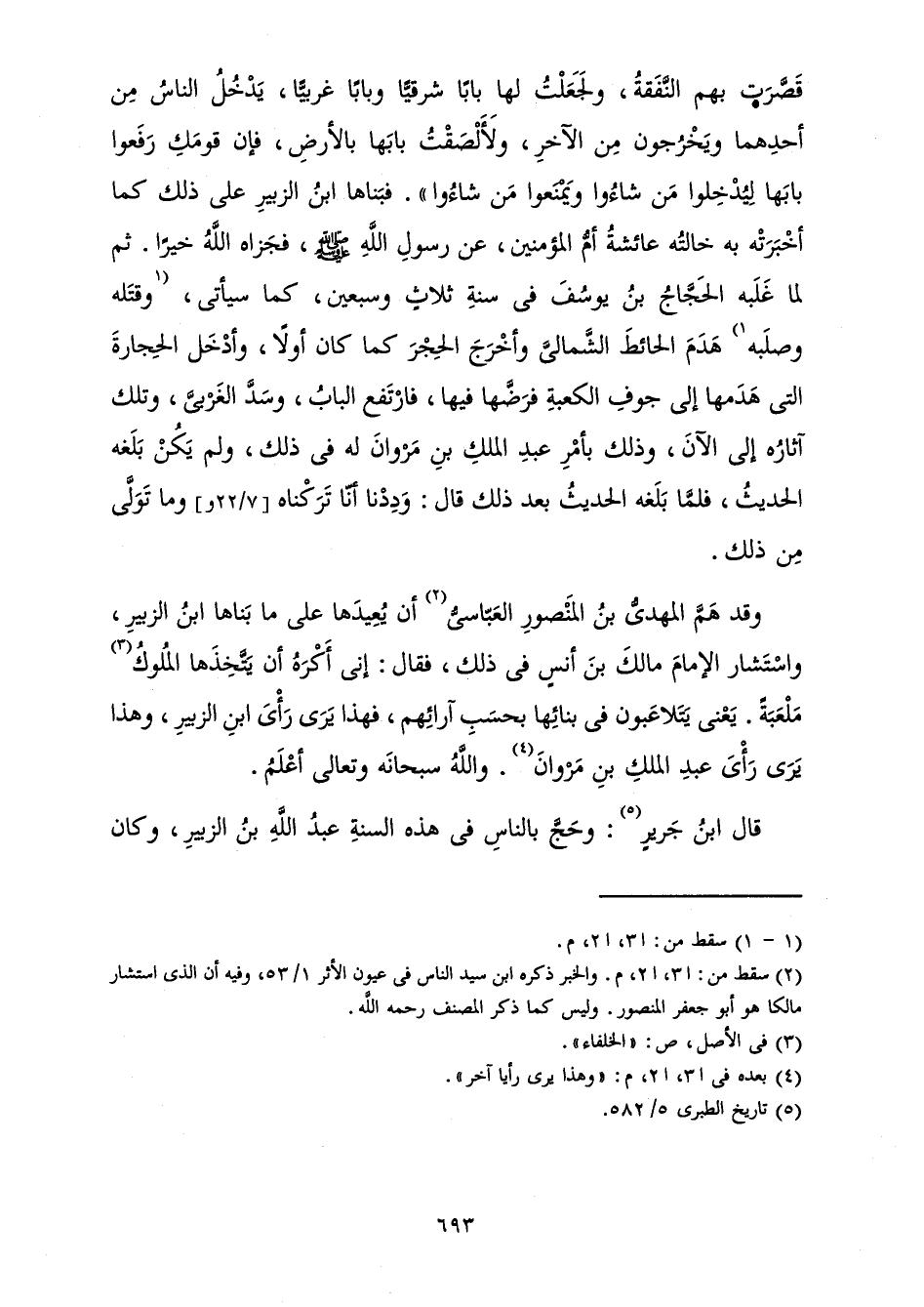 وَقَدْ هَمَّ الْمَهْدِيُّ بْنُ الْمَنْصُورِ الْعَبَّاسِيُّ أَنْ يُعِيدَهَا عَلَى مَا بَنَاهَا ابْنُ الزُّبَيْرِ، وَاسْتَشَارَ الْإِمَامَ مَالِكَ بْنَ أَنَسٍ فِي ذَلِكَ، فَقَالَ: إِنِّي أَكْرَهُ أَنْ يَتَّخِذَهَا الْمُلُوكُ مَلْعَبَةً. يَعْنِي يَتَلَاعَبُونَ فِي بِنَائِهَا بِحَسْبِ آرَائِهِمْ، فَهَذَا يَرَى رَأْيَ ابْنِ الزُّبَيْرِ، وَهَذَا يَرَى رَأْيَ عَبْدِ الْمَلِكِ بْنِ مَرْوَانَ. وَاللَّهُ سُبْحَانَهُ وَتَعَالَى أَعْلَمُ.