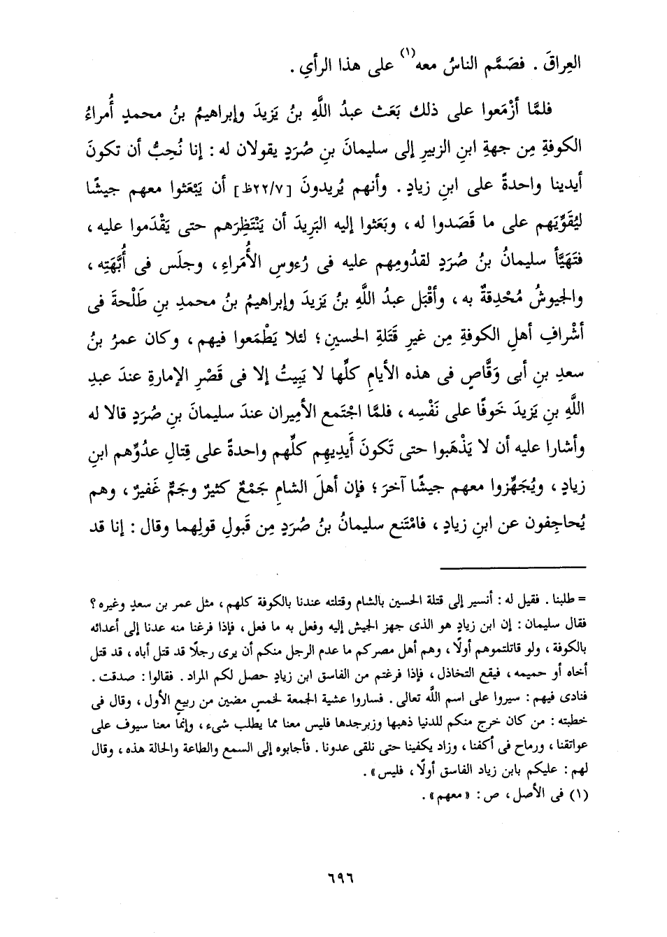 فَلَمَّا أَزْمَعُوا عَلَى ذَلِكَ بَعَثَ عَبْدُ اللَّهِ بْنُ يَزِيدَ وَإِبْرَاهِيمُ بْنُ مُحَمَّدٍ أُمَرَاءُ الْكُوفَةِ مِنْ جِهَةِ ابْنِ الزُّبَيْرِ إِلَى سُلَيْمَانَ بْنِ صُرَدٍ يَقُولَانِ لَهُ: إِنَّا نُحِبُّ أَنْ تَكُونَ أَيْدِينَا وَاحِدَةً عَلَى ابْنِ زِيَادٍ. وَأَنَّهُمْ يُرِيدُونَ أَنْ يَبْعَثُوا مَعَهُمْ جَيْشًا لِيُقَوِّيَهُمْ عَلَى مَا قَصَدُوا لَهُ، وَبَعَثُوا إِلَيْهِ الْبَرِيدَ أَنْ يَنْتَظِرَهُمْ حَتَّى يَقْدُمُوا عَلَيْهِ، فَتَهَيَّأَ سُلَيْمَانُ بْنُ صُرَدٍ لِقُدُومِهِمْ عَلَيْهِ فِي رُءُوسِ الْأُمَرَاءِ، وَجَلَسَ فِي أُبَّهَتِهِ، وَالْجُيُوشُ مُحْدِقَةٌ بِهِ، وَأَقْبَلَ عَبْدُ اللَّهِ بْنُ يَزِيدَ وَإِبْرَاهِيمُ بْنُ مُحَمَّدِ بْنِ طَلْحَةَ فِي أَشْرَافِ أَهْلِ الْكُوفَةِ مِنْ غَيْرِ قَتَلَةِ الْحُسَيْنِ ; لِئَلَّا يَطْمَعُوا فِيهِمْ، وَكَانَ عُمَرُ بْنُ سَعْدِ بْنِ أَبِي وَقَّاصٍ فِي هَذِهِ الْأَيَّامِ كُلِّهَا لَا يَبِيتُ إِلَّا فِي قَصْرِ الْإِمَارَةِ عِنْدَ عَبْدِ اللَّهِ بْنِ يَزِيدَ خَوْفًا عَلَى نَفْسِهِ، فَلَمَّا اجْتَمَعَ الْأَمِيرَانِ عِنْدَ سُلَيْمَانَ بْنِ صُرَدٍ قَالَا لَهُ وَأَشَارَا عَلَيْهِ أَنْ لَا يَذْهَبُوا حَتَّى تَكُونَ أَيْدِيهِمْ كُلِّهِمْ وَاحِدَةً عَلَى قِتَالِ عَدُوِّهِمُ ابْنِ زِيَادٍ، وَيُجَهِّزُوا مَعَهُمْ جَيْشًا آخَرَ ; فَإِنَّ أَهْلَ الشَّامِ جَمْعٌ كَثِيرٌ وَجَمٌّ غَفِيرٌ، وَهُمْ يُحَاجِفُونَ عَنِ ابْنِ زِيَادٍ، فَامْتَنَعَ سُلَيْمَانُ بْنُ صُرَدٍ مِنْ قَبُولِ قَوْلِهِمَا وَقَالَ: إِنَّا قَدْ
