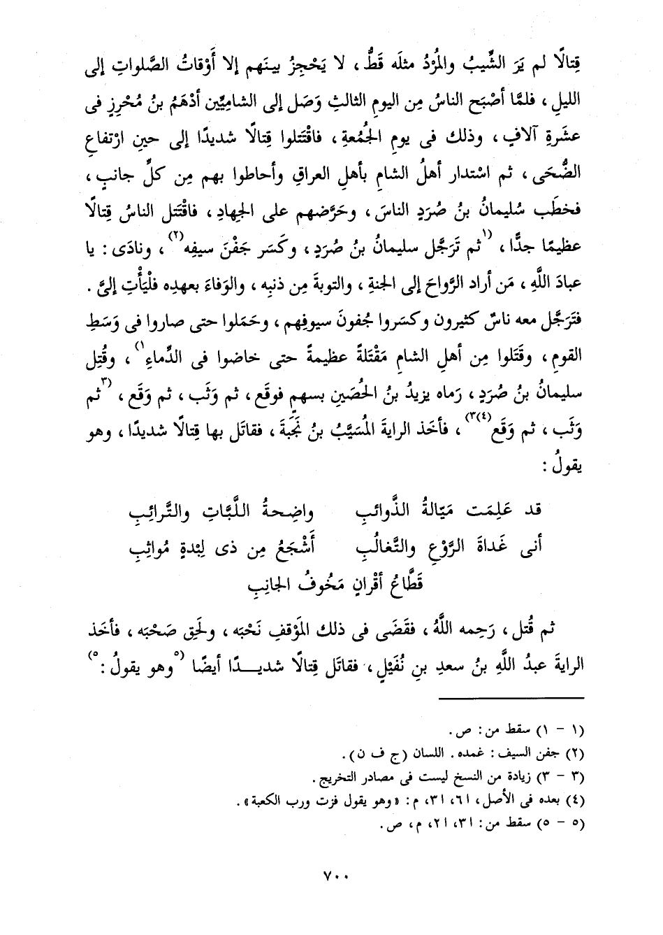 قِتَالًا لَمْ يَرَ الشِّيبُ وَالْمُرْدُ مِثْلَهُ قَطُّ، لَا يَحْجِزُ بَيْنَهُمْ إِلَّا أَوْقَاتُ الصَّلَوَاتِ إِلَى اللَّيْلِ، فَلَمَّا أَصْبَحَ النَّاسُ مِنَ الْيَوْمِ الثَّالِثِ وَصَلَ إِلَى الشَّامِيِّينَ أَدْهَمُ بْنُ مُحْرِزٍ فِي عَشَرَةِ آلَافٍ، وَذَلِكَ فِي يَوْمِ الْجُمُعَةِ، فَاقْتَتَلُوا قِتَالًا شَدِيدًا إِلَى حِينِ ارْتِفَاعِ الضُّحَى، ثُمَّ اسْتَدَارَ أَهْلُ الشَّامِ بِأَهْلِ الْعِرَاقِ وَأَحَاطُوا بِهِمْ مِنْ كُلِّ جَانِبٍ، فَخَطَبَ سُلَيْمَانُ بْنُ صُرَدٍ النَّاسَ، وَحَرَّضَهُمْ عَلَى الْجِهَادِ، فَاقْتَتَلَ النَّاسُ قِتَالًا عَظِيمًا جِدًّا، ثُمَّ تَرَجَّلَ سُلَيْمَانُ بْنُ صُرَدٍ وَكَسَرَ جَفْنَ سَيْفِهِ، وَنَادَى: يَا عِبَادَ اللَّهِ، مَنْ أَرَادَ الرَّوَاحَ إِلَى الْجَنَّةِ، وَالتَّوْبَةَ مِنْ ذَنْبِهِ، وَالْوَفَاءَ بِعَهْدِهِ فَلْيَأْتِ إِلَيَّ. فَتَرَجَّلَ مَعَهُ نَاسٌ كَثِيرُونَ وَكَسَرُوا جُفُونَ سُيُوفِهِمْ، وَحَمَلُوا حَتَّى صَارُوا فِي وَسَطِ الْقَوْمِ، وَقَتَلُوا مِنْ أَهْلِ الشَّامِ مَقْتَلَةً عَظِيمَةً حَتَّى خَاضُوا فِي الدِّمَاءِ، وَقُتِلَ سُلَيْمَانُ بْنُ صُرَدٍ، رَمَاهُ يَزِيدُ بْنُ الْحُصَيْنِ بِسَهْمٍ فَوَقَعَ، ثُمَّ وَثَبَ، ثُمَّ وَقَعَ، ثُمَّ وَثَبَ، ثُمَّ وَقَعَ، فَأَخَذَ الرَّايَةَ الْمُسَيَّبُ بْنُ نَجَبَةَ، فَقَاتَلَ بِهَا قِتَالًا شَدِيدًا، وَهُوَ يَقُولُ: