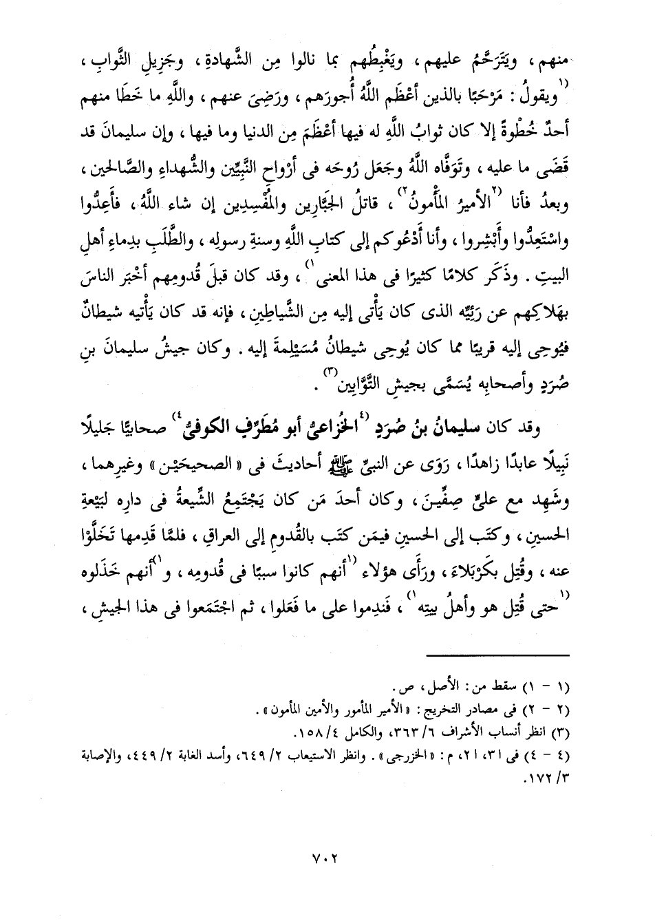 وَقَدْ كَانَ سُلَيْمَانُ بْنُ صُرَدٍ الْخُزَاعِيُّ أَبُو مُطَرِّفٍ الْكُوفِيُّ صَحَابِيًّا جَلِيلًا نَبِيلًا عَابِدًا زَاهِدًا، رَوَى عَنِ النَّبِيِّ صَلَّى اللَّهُ عَلَيْهِ وَسَلَّمَ أَحَادِيثَ فِي " الصَّحِيحَيْنِ " وَغَيْرِهِمَا، وَشَهِدَ مَعَ عَلِيٍّ صِفِّينَ، وَكَانَ أَحَدُ مَنْ كَانَ يَجْتَمِعُ الشِّيعَةُ فِي دَارِهِ لِبَيْعَةِ الْحُسَيْنِ، وَكَتَبَ إِلَى الْحُسَيْنِ فِيمَنْ كَتَبَ بِالْقُدُومِ إِلَى الْعِرَاقِ، فَلَمَّا قَدِمَهَا تَخَلَّوْا عَنْهُ، وَقُتِلَ بِكَرْبَلَاءَ، وَرَأَى هَؤُلَاءِ أَنَّهُمْ كَانُوا سَبَبًا فِي قُدُومِهِ، وَأَنَّهُمْ خَذَلُوهُ حَتَّى قُتِلَ هُوَ وَأَهْلُ بَيْتِهِ، فَنَدِمُوا عَلَى مَا فَعَلُوا، ثُمَّ اجْتَمَعُوا فِي هَذَا الْجَيْشِ،