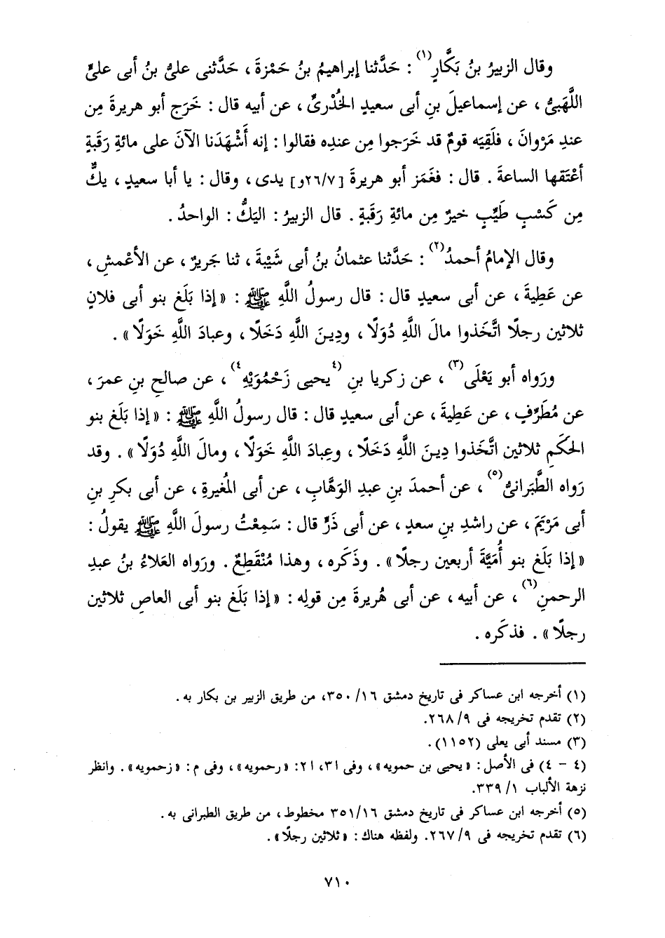 وَرَوَاهُ أَبُو يَعْلَى، عَنْ زَكَرِيَّا بْنِ يَحْيَى زَحْمُوَيْهِ، عَنْ صَالِحِ بْنِ عُمَرَ، عَنْ مُطَرِّفٍ، عَنْ عَطِيَّةَ، عَنْ أَبِي سَعِيدٍ قَالَ: قَالَ رَسُولُ اللَّهِ صَلَّى اللَّهُ عَلَيْهِ وَسَلَّمَ: " «إِذَا بَلَغَ بَنُو الْحَكَمِ ثَلَاثِينَ اتَّخَذُوا دِينَ اللَّهِ دَخَلًا، وَعِبَادَ اللَّهِ خَوَلًا، وَمَالَ اللَّهِ دُوَلًا» ". وَقَدْ رَوَاهُ الطَّبَرَانِيُّ، عَنْ أَحْمَدَ بْنِ عَبْدِ الْوَهَّابِ، عَنْ أَبِي الْمُغِيرَةِ، عَنْ أَبِي بَكْرِ بْنِ أَبِي مَرْيَمَ، عَنْ رَاشِدِ بْنِ سَعْدٍ، عَنْ أَبِي ذَرٍّ قَالَ: سَمِعْتُ رَسُولَ اللَّهِ صَلَّى اللَّهُ عَلَيْهِ وَسَلَّمَ يَقُولُ: " «إِذَا بَلَغَ بَنُو أُمَيَّةَ أَرْبَعِينَ رَجُلًا» ". وَذَكَرَهُ، وَهَذَا مُنْقَطِعٌ. وَرَوَاهُ الْعَلَاءُ بْنُ عَبْدِ الرَّحْمَنِ، عَنْ أَبِيهِ، عَنْ أَبِي هُرَيْرَةَ مِنْ قَوْلِهِ: «إِذَا بَلَغَ بَنُو أَبِي الْعَاصِ ثَلَاثِينَ رَجُلًا» فَذَكَرَهُ.
