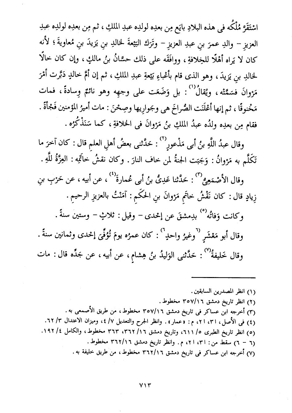اسْتَقَرَّ مُلْكُهُ فِي هَذِهِ الْبِلَادِ بَايَعَ مِنْ بَعْدِهِ لِوَلَدِهِ عَبْدِ الْمَلِكِ، ثُمَّ مِنْ بَعْدِهِ لِوَلَدِهِ عَبْدِ الْعَزِيزِ - وَالِدِ عُمَرَ بْنِ عَبْدِ الْعَزِيزِ - وَتَرَكَ الْبَيْعَةَ لِخَالِدِ بْنِ يَزِيدَ بْنِ مُعَاوِيَةَ ; لِأَنَّهُ كَانَ لَا يَرَاهُ أَهْلًا لِلْخِلَافَةِ، وَوَافَقَهُ عَلَى ذَلِكَ حَسَّانُ بْنُ مَالِكٍ، وَإِنْ كَانَ خَالًا لِخَالِدِ بْنِ يَزِيدَ، وَهُوَ الَّذِي قَامَ بِأَعْبَاءِ بَيْعَةِ عَبْدِ الْمَلِكِ، ثُمَّ إِنَّ أُمَّ خَالِدٍ دَبَّرَتْ أَمْرَ مَرْوَانَ فَسَمَّتْهُ، وَيُقَالُ: بَلْ وَضَعَتْ عَلَى وَجْهِهِ وَهُوَ نَائِمٌ وِسَادَةً، فَمَاتَ مَخْنُوقًا، ثُمَّ إِنَّهَا أَعْلَنَتِ الصُّرَاخَ هِيَ وَجَوَارِيهَا وَصِحْنَ: مَاتَ أَمِيرُ الْمُؤْمِنِينَ فَجْأَةً. فَقَامَ مِنْ بَعْدِهِ وَلَدُهُ عَبْدُ الْمَلِكِ بْنُ مَرْوَانَ فِي الْخِلَافَةِ، كَمَا سَنَذْكُرُهُ.