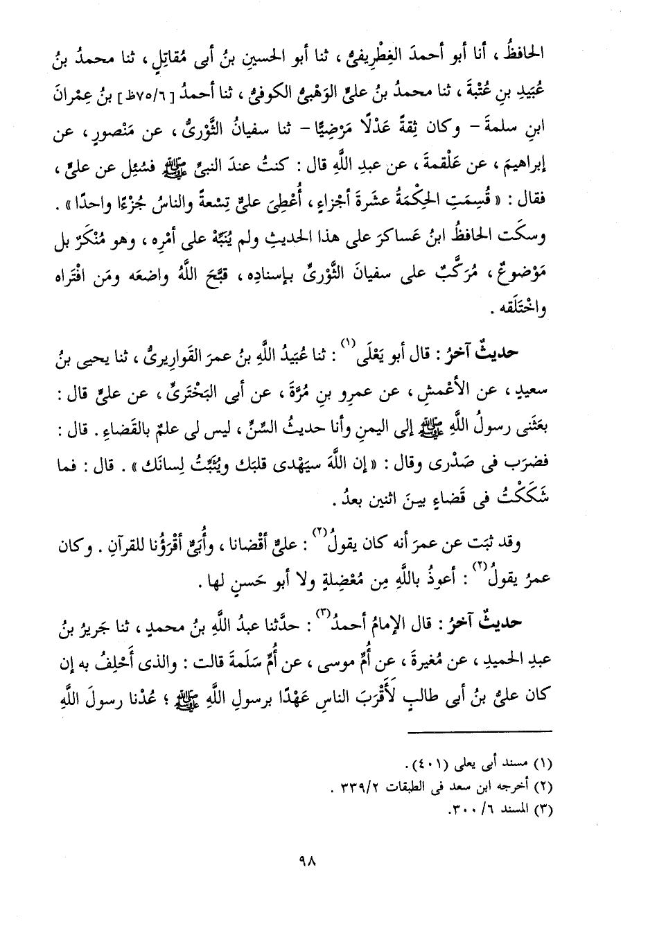 الْحَافِظُ، أَنَا أَبُو أَحْمَدَ الْغِطْرِيفِيُّ، ثَنَا أَبُو الْحُسَيْنِ بْنُ أَبِي مُقَاتِلٍ، ثَنَا مُحَمَّدُ بْنُ عُبَيْدِ بْنِ عَتَبَةَ، ثَنَا مُحَمَّدُ بْنُ عَلِيٍّ الْوَهْبِيُّ الْكُوفِيُّ، ثَنَا أَحْمَدُ بْنُ عِمْرَانَ بْنِ سَلَمَةَ - وَكَانَ ثِقَةً عَدْلًا مَرْضِيًّا - ثَنَا سُفْيَانُ الثَّوْرِيُّ، عَنْ مَنْصُورٍ، عَنْ إِبْرَاهِيمَ، عَنْ عَلْقَمَةَ، عَنْ عَبْدِ اللَّهِ قَالَ: «كُنْتُ عِنْدَ النَّبِيِّ صَلَّى اللَّهُ عَلَيْهِ وَسَلَّمَ فَسُئِلَ عَنْ عَلِيٍّ، فَقَالَ: " قُسِمَتِ الْحِكْمَةُ عَشَرَةَ أَجْزَاءٍ، أُعْطِيَ عَلِيٌّ تِسْعَةً وَالنَّاسُ جُزْءًا وَاحِدًا» وَسَكَتَ الْحَافِظُ ابْنُ عَسَاكِرَ عَلَى هَذَا الْحَدِيثِ وَلَمْ يُنَبِّهْ عَلَى أَمْرِهِ، وَهُوَ مُنْكَرٌ بَلْ مَوْضُوعٌ، مُرَكَّبٌ عَلَى سُفْيَانَ الثَّوْرِيِّ بِإِسْنَادِهِ، قَبَّحَ اللَّهُ وَاضِعَهُ وَمَنِ افْتَرَاهُ وَاخْتَلَقَهُ.