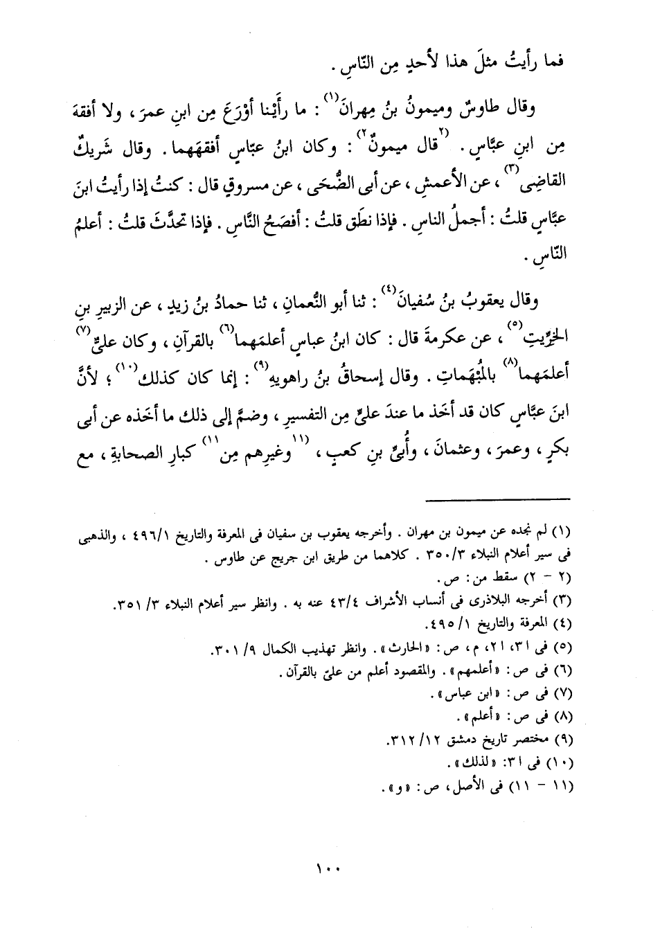 وَقَالَ طَاوُسٌ، وَمَيْمُونُ بْنُ مِهْرَانَ: مَا رَأَيْنَا أَوْرَعَ مِنَ ابْنِ عُمَرَ، وَلَا أَفْقَهَ مِنَ ابْنِ عَبَّاسٍ. قَالَ مَيْمُونٌ: وَكَانَ ابْنُ عَبَّاسٍ أَفْقَهَهُمَا. وَقَالَ شُرَيْكٌ الْقَاضِي، عَنِ الْأَعْمَشِ، عَنْ أَبِي الضُّحَى، عَنْ مَسْرُوقٍ قَالَ: كُنْتُ إِذَا رَأَيْتُ ابْنَ عَبَّاسٍ قُلْتُ: أَجْمَلُ النَّاسِ. فَإِذَا نَطَقَ قُلْتُ: أَفْصَحُ النَّاسِ. فَإِذَا تَحَدَّثَ قُلْتُ: أَعْلَمُ النَّاسِ.