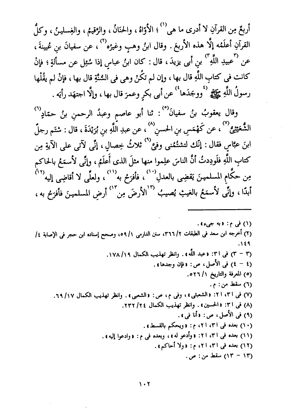 أَرْبَعٌ مِنَ الْقُرْآنِ لَا أَدْرِي مَا هِيَ ; الْأَوَّاهُ، وَالْحَنَّانُ، وَالرَّقِيمُ، وَالْغِسْلِينُ، وَكُلُّ الْقُرْآنِ أَعْلَمُهُ إِلَّا هَذِهِ الْأَرْبَعَ. وَقَالَ ابْنُ وَهْبٍ وَغَيْرُهُ، عَنْ سُفْيَانَ بْنِ عُيَيْنَةَ، عَنْ عُبَيْدِ اللَّهِ بْنِ أَبِي يَزِيدَ، قَالَ: كَانَ ابْنُ عَبَّاسٍ إِذَا سُئِلَ عَنْ مَسْأَلَةٍ ; فَإِنْ كَانَتْ فِي كِتَابِ اللَّهِ قَالَ بِهَا، وَإِنْ لَمْ تَكُنْ وَهِيَ فِي السُّنَّةِ قَالَ بِهَا، فَإِنْ لَمْ يَقُلْهَا رَسُولُ اللَّهِ صَلَّى اللَّهُ عَلَيْهِ وَسَلَّمَ وَوَجَدَهَا عَنْ أَبِي بَكْرٍ، وَعُمَرَ قَالَ بِهَا، وَإِلَّا اجْتَهَدَ رَأْيَهُ.