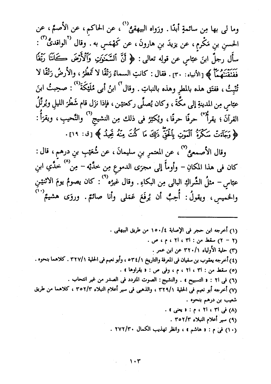 وَمَا لِي بِهَا مِنْ سَائِمَةٍ أَبَدًا. وَرَوَاهُ الْبَيْهَقِيُّ، عَنِ الْحَاكِمِ، عَنِ الْأَصَمِّ، عَنِ الْحَسَنِ بْنِ مَكْرَمٍ، عَنْ يَزِيدَ بْنِ هَارُونَ، عَنْ كَهْمَسٍ بِهِ. وَقَالَ الْوَاقِدِيُّ: سَأَلَ رَجُلٌ ابْنَ عَبَّاسٍ عَنْ قَوْلِهِ تَعَالَى {أَنَّ السَّمَاوَاتِ وَالْأَرْضَ كَانَتَا رَتْقًا فَفَتَقْنَاهُمَا} [الأنبياء: 30] فَقَالَ: كَانَتِ السَّمَاءُ رَتْقًا لَا تَمْطُرُ، وَالْأَرْضُ رَتْقًا لَا تُنْبِتُ، فَفَتَقَ هَذِهِ بِالْمَطَرِ، وَهَذِهِ بِالنَّبَاتِ. وَقَالَ ابْنُ أَبِي مُلَيْكَةَ: صَحِبْتُ ابْنَ عَبَّاسٍ مِنَ الْمَدِينَةِ إِلَى مَكَّةَ، وَكَانَ يُصَلِّي رَكْعَتَيْنِ، فَإِذَا نَزَلَ قَامَ شَطْرَ اللَّيْلِ، وَيُرَتِّلُ الْقُرْآنَ يَقْرَأُ حَرْفًا حَرْفًا، وَيُكْثِرُ فِي ذَلِكَ مِنَ النَّشِيجِ وَالنَّحِيبِ، وَيَقْرَأُ {وَجَاءَتْ سَكْرَةُ الْمَوْتِ بِالْحَقِّ ذَلِكَ مَا كُنْتَ مِنْهُ تَحِيدُ} [ق: 19]