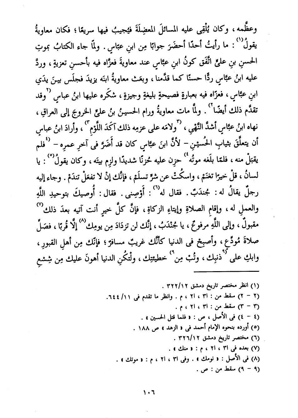 وَعَظَّمَهُ، وَكَانَ يُلْقِي عَلَيْهِ الْمَسَائِلَ الْمُعْضِلَةَ فَيُجِيبُ فِيهَا سَرِيعًا، فَكَانَ مُعَاوِيَةُ يَقُولُ: مَا رَأَيْتُ أَحَدًا أَحَضَرَ جَوَابًا مِنَ ابْنِ عَبَّاسٍ. وَلَمَّا جَاءَ الْكِتَابُ بِمَوْتِ الْحَسَنِ بْنِ عَلِيٍّ اتَّفَقَ كَوْنُ ابْنِ عَبَّاسٍ عِنْدَ مُعَاوِيَةَ فَعَزَّاهُ فِيهِ بِأَحْسَنِ تَعْزِيَةٍ، وَرَدَّ عَلَيْهِ ابْنُ عَبَّاسٍ رَدًّا حَسَنًا كَمَا قَدَّمْنَا، وَبَعَثَ مُعَاوِيَةُ ابْنَهُ يَزِيدَ فَجَلَسَ بَيْنَ يَدَيِ ابْنِ عَبَّاسٍ فَعَزَّاهُ بِعِبَارَةٍ فَصِيحَةٍ بَلِيغَةٍ وَجِيزَةٍ، شَكَرَهُ عَلَيْهَا ابْنُ عَبَّاسٍ - وَقَدْ تَقَدَّمَ ذَلِكَ أَيْضًا - وَلَمَّا مَاتَ مُعَاوِيَةُ وَرَامَ الْحُسَيْنُ بْنُ عَلِيٍّ الْخُرُوجَ إِلَى الْعِرَاقِ، نَهَاهُ ابْنُ عَبَّاسٍ أَشَدَّ النَّهْيِ، وَأَرَادَ ابْنُ عَبَّاسٍ أَنْ يَتَعَلَّقَ بِثِيَابِ الْحُسَيْنِ ; - لِأَنَّ ابْنَ عَبَّاسٍ كَانَ قَدْ أَضَرَّ فِي آخِرِ عُمْرِهِ - فَلَمْ يَقْبَلْ مِنْهُ، فَلَمَّا بَلَغَهُ مَوْتُهُ حَزِنَ عَلَيْهِ حُزْنًا شَدِيدًا وَلَزِمَ بَيْتَهُ، وَكَانَ يَقُولُ: يَا لِسَانُ قُلْ خَيْرًا تَغْنَمْ، وَاسْكُتْ عَنْ شَرٍّ تَسْلَمْ، فَإِنَّكَ إِنْ لَا تَفْعَلْ تَنْدَمْ، وَجَاءَ إِلَيْهِ رَجُلٌ يُقَالُ لَهُ: جُنْدَبٌ. فَقَالَ لَهُ أَوْصِنِي: فَقَالَ: أُوصِيكَ بِتَوْحِيدِ اللَّهِ، وَالْعَمَلِ لَهُ، وَإِقَامِ الصَّلَاةِ وَإِيتَاءِ الزَّكَاةِ، فَإِنَّ كُلَّ خَيْرٍ أَنْتَ آتِيهِ بَعْدَ ذَلِكَ مَقْبُولٌ، وَإِلَى اللَّهِ مَرْفُوعٌ، يَا جُنْدَبُ، إِنَّكَ لَنْ تَزْدَادَ مِنْ يَوْمِكَ إِلَّا قُرْبًا، فَصَلِّ صَلَاةَ مُوَدِّعٍ، وَأَصْبِحْ فِي الدُّنْيَا كَأَنَّكَ غَرِيبٌ مُسَافِرٌ، فَإِنَّكَ مِنْ أَهْلِ الْقُبُورِ، وَابْكِ عَلَى ذَنْبِكَ، وَتُبْ مِنْ خَطِيئَتِكَ، وَلْتَكُنِ الدُّنْيَا عَلَيْكَ أَهْوَنَ مِنْ شِسْعِ
