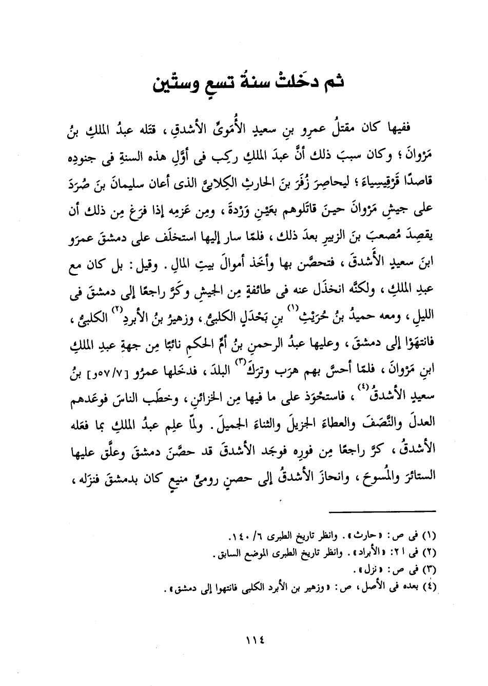فَفِيهَا كَانَ مَقْتَلُ عَمْرِو بْنِ سَعِيدٍ الْأُمَوِيِّ الْأَشْدَقِ، قَتَلَهُ عَبْدُ الْمَلِكِ بْنُ مَرْوَانَ، وَكَانَ سَبَبَ ذَلِكَ أَنَّ عَبْدَ الْمَلِكِ رَكِبَ فِي أَوَّلِ هَذِهِ السَّنَةِ فِي جُنُودِهِ قَاصِدًا قَرْقِيسِيَاءَ ; لِيُحَاصِرَ زُفَرَ بْنَ الْحَارِثِ الْكِلَابِيَّ الَّذِي أَعَانَ سُلَيْمَانَ بْنَ صُرَدَ عَلَى جَيْشِ مَرْوَانَ حِينَ قَاتَلُوهُمْ بِعَيْنِ وَرْدَةَ، وَمِنْ عَزْمِهِ إِذَا فَرَغَ مِنْ ذَلِكَ أَنْ يَقْصِدَ مُصْعَبَ بْنَ الزُّبَيْرِ بَعْدَ ذَلِكَ، فَلَمَّا سَارَ إِلَيْهَا اسْتَخْلَفَ عَلَى دِمَشْقَ عَمْرَو بْنَ سَعِيدٍ الْأَشْدَقَ، فَتَحَصَّنَ بِهَا وَأَخْذَ أَمْوَالَ بَيْتِ الْمَالِ. وَقِيلَ: بَلْ كَانَ مَعَ عَبْدِ الْمَلِكِ، وَلَكِنَّهُ انْخَذَلَ عَنْهُ فِي طَائِفَةٍ مِنَ الْجَيْشِ وَكَرَّ رَاجِعًا إِلَى دِمَشْقَ فِي اللَّيْلِ، وَمَعَهُ حُمَيْدُ بْنُ حُرَيْثِ بْنِ بَحْدَلٍ الْكَلْبِيُّ، وَزُهَيْرُ بْنُ الْأَبْرَدِ الْكَلْبِيُّ، فَانْتَهَوْا إِلَى دِمَشْقَ وَعَلَيْهَا عَبْدُ الرَّحْمَنِ بْنُ أُمِّ الْحَكَمِ نَائِبًا مِنْ جِهَةِ عَبْدِ الْمَلِكِ بْنِ مَرْوَانَ، فَلَمَّا أَحَسَّ بِهِمْ هَرَبَ وَتَرَكَ الْبَلَدَ، فَدَخَلَهَا عَمْرُو بْنُ سَعِيدٍ الْأَشْدَقُ، فَاسْتَحْوَذَ عَلَى مَا فِيهَا مِنَ الْخَزَائِنِ، وَخَطَبَ بِالنَّاسِ فَوَعَدَهُمُ الْعَدْلَ وَالنَّصَفَ وَالْعَطَاءَ الْجَزِيلَ وَالثَّنَاءَ الْجَمِيلَ، وَلَمَّا عَلِمَ عَبْدُ الْمَلِكِ بِمَا فَعَلَهُ الْأَشْدَقُ، كَرَّ رَاجِعًا مِنْ فَوْرِهِ فَوَجَدَ الْأَشْدَقَ قَدْ حَصَّنَ دِمَشْقَ وَعَلَّقَ عَلَيْهَا السَّتَائِرَ وَالْمُسُوحَ، وَانْحَازَ الْأَشْدَقُ إِلَى حِصْنٍ رُومِيٍّ مَنِيعٍ كَانَ بِدِمَشْقَ فَنَزَلَهُ،