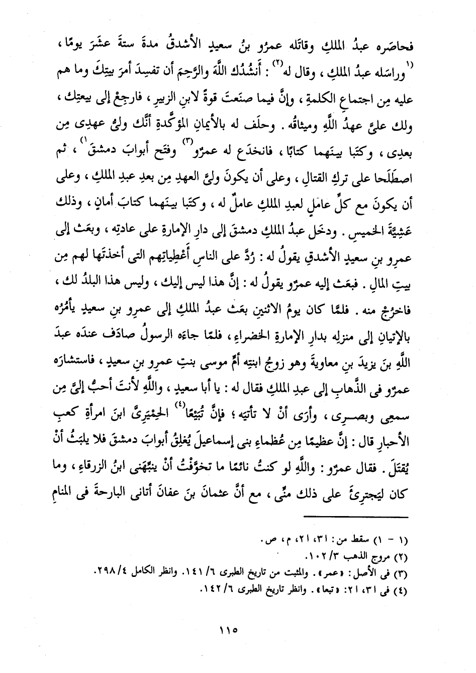 فَحَاصَرَهُ عَبْدُ الْمَلِكِ وَقَاتَلَهُ عَمْرُو بْنُ سَعِيدٍ الْأَشْدَقُ مُدَّةَ سِتَّةَ عَشَرَ يَوْمًا، وَرَاسَلَهُ عَبْدُ الْمَلِكِ، وَقَالَ لَهُ: أَنْشُدُكَ اللَّهَ وَالرَّحِمَ أَنْ تُفْسِدَ أَمْرَ بَيْتِكَ وَمَا هُمْ عَلَيْهِ مِنِ اجْتِمَاعِ الْكَلِمَةِ، وَإِنَّ فِيمَا صَنَعْتَ قُوَّةً لِابْنِ الزُّبَيْرِ، فَارْجِعْ إِلَى بَيْتِكَ، وَلَكَ عَلَيَّ عَهْدُ اللَّهِ وَمِيثَاقُهُ. وَحَلَفَ بِالْأَيْمَانِ الْمُؤَكَّدَةِ أَنَّكَ وَلِيُّ عُهَدِي مِنْ بَعْدِي، وَكَتَبَا بَيْنَهُمَا كِتَابًا، فَانْخَدَعَ لَهُ عَمْرٌو وَفَتَحَ أَبْوَابَ دِمَشْقَ، ثُمَّ اصْطَلَحَا عَلَى تَرْكِ الْقِتَالِ، وَعَلَى أَنْ يَكُونَ وَلِيَّ الْعَهْدِ مِنْ بَعْدِ عَبْدِ الْمَلِكِ، وَعَلَى أَنْ يَكُونَ مَعَ كُلِّ عَامِلٍ لِعَبْدِ الْمَلِكِ عَامِلٌ لَهُ، وَكَتَبَا بَيْنَهُمَا كِتَابَ أَمَانٍ، وَذَلِكَ عَشِيَّةَ الْخَمِيسِ. وَدَخَلَ عَبْدُ الْمَلِكِ دِمَشْقَ إِلَى دَارِ الْإِمَارَةِ عَلَى عَادَتِهِ، وَبَعَثَ إِلَى عَمْرِو بْنِ سَعِيدٍ الْأَشْدَقِ يَقُولُ لَهُ: رُدَّ عَلَى النَّاسِ أَعْطِيَاتِهِمُ الَّتِي أَخَذْتَهَا لَهُمْ مِنْ بَيْتِ الْمَالِ، فَبَعَثَ إِلَيْهِ عَمْرٌو يَقُولُ لَهُ: إِنَّ هَذَا لَيْسَ إِلَيْكَ، وَلَيْسَ هَذَا الْبَلَدُ لَكَ، فَاخْرُجْ مِنْهُ، فَلَمَّا كَانَ يَوْمُ الِاثْنَيْنِ بَعَثَ عَبْدُ الْمَلِكِ إِلَى عَمْرِو بْنِ سَعِيدٍ يَأْمُرُهُ بِالْإِتْيَانِ إِلَى مَنْزِلِهِ بِدَارِ الْإِمَارَةِ الْخَضْرَاءِ فَلَمَّا جَاءَهُ الرَّسُولُ صَادَفَ عِنْدَهُ عَبْدَ اللَّهِ بْنَ يَزِيدَ بْنِ مُعَاوِيَةَ وَهُوَ زَوْجُ ابْنَتِهِ أُمِّ مُوسَى بِنْتِ عَمْرِو بْنِ سَعِيدٍ، فَاسْتَشَارَهُ عَمْرٌو فِي الذَّهَابِ إِلَى عَبْدِ الْمَلِكِ فَقَالَ لَهُ: يَا أَبَا سَعِيدٍ وَاللَّهِ لَأَنْتَ أَحَبُّ إِلَيَّ مِنْ سَمْعِي وَبَصَرِي، وَأَرَى أَنْ لَا تَأْتِيَهُ ; فَإِنَّ تُبَيْعًا الْحِمْيَرِيَّ ابْنَ امْرَأَةِ كَعْبِ الْأَحْبَارِ قَالَ: إِنَّ عَظِيمًا مِنْ عُظَمَاءَ بَنِي إِسْمَاعِيلَ يُغْلِقُ أَبْوَابَ دِمَشْقَ فَلَا يَلْبَثُ أَنْ يُقْتَلَ. فَقَالَ عَمْرٌو: وَاللَّهِ لَوْ كُنْتُ نَائِمًا مَا تَخَوَّفْتُ أَنْ يُنَبِّهَنِي ابْنُ الزَّرْقَاءِ، وَمَا كَانَ لِيَجْتَرِئَ عَلَى ذَلِكَ مِنِّي، مَعَ أَنَّ عُثْمَانَ بْنَ عَفَّانَ أَتَانِي الْبَارِحَةَ فِي الْمَنَامِ