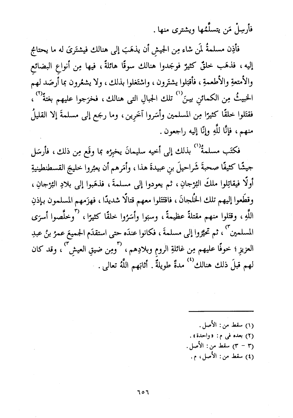 فَأَذِنَ مَسْلَمَةُ لِمَنْ شَاءَ مِنَ الْجَيْشِ أَنْ يَذْهَبَ إِلَى هُنَاكَ فَيَشْتَرِي لَهُ مَا يَحْتَاجُ إِلَيْهِ، فَذَهَبَ خَلْقٌ كَثِيرٌ فَوَجَدُوا هُنَالِكَ سُوقًا هَائِلَةً، فِيهَا مِنْ أَنْوَاعِ الْبَضَائِعِ وَالْأَمْتِعَةِ وَالْأَطْعِمَةِ، فَأَقْبَلُوا يَشْتَرُونَ، وَاشْتَغَلُوا بِذَلِكَ، وَلَا يَشْعُرُونَ بِمَا أَرْصَدَ لَهُمُ الْخَبِيثُ مِنَ الْكَمَائِنِ بَيْنَ تِلْكَ الْجِبَالِ الَّتِي هُنَالِكَ، فَخَرَجُوا عَلَيْهِمْ بَغْتَةً، فَقَتَلُوا خَلْقًا كَثِيرًا مِنَ الْمُسْلِمِينَ وَأَسَرُوا آخَرِينَ، وَمَا رَجَعَ إِلَى مَسْلَمَةَ إِلَّا الْقَلِيلُ مِنْهُمْ فَإِنَّا لِلَّهِ وَإِنَّا إِلَيْهِ رَاجِعُونَ.