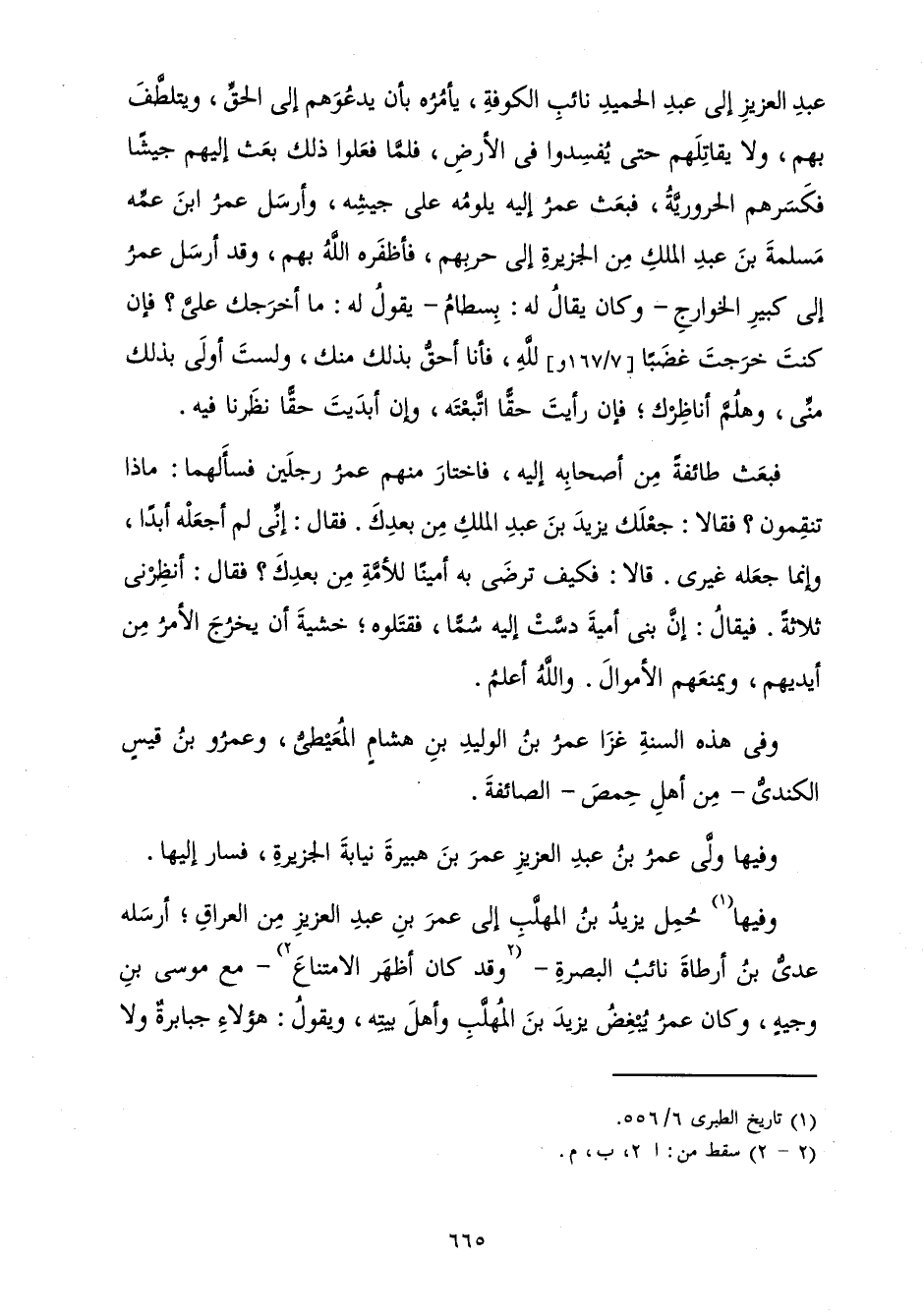 إِلَى عَبْدِ الْحَمِيدِ نَائِبِ الْكُوفَةِ يَأْمُرُهُ بِأَنْ يَدْعُوَهُمْ إِلَى الْحَقِّ، وَيَتَلَطَّفَ بِهِمْ، وَلَا يُقَاتِلَهُمْ حَتَّى يُفْسِدُوا فِي الْأَرْضِ، فَلَمَّا فَعَلُوا ذَلِكَ بَعَثَ إِلَيْهِمْ جَيْشًا فَكَسَرَهُمُ الْحَرُورِيَّةُ، فَبَعَثَ عُمَرُ إِلَيْهِ يَلُومُهُ عَلَى جَيْشِهِ، وَأَرْسَلَ عُمَرُ ابْنَ عَمِّهِ مَسْلَمَةَ بْنَ عَبْدِ الْمَلِكِ مِنَ الْجَزِيرَةِ إِلَى حَرْبِهِمْ، فَأَظْفَرَهُ اللَّهُ بِهِمْ، وَقَدْ أَرْسَلَ عُمَرُ إِلَى كَبِيرِ الْخَوَارِجِ وَكَانَ يُقَالُ لَهُ: بِسْطَامُ يَقُولُ لَهُ: مَا أَخْرَجَكَ عَلَيَّ؟ فَإِنْ كُنْتَ خَرَجْتَ غَضَبًا لِلَّهِ فَأَنَا أَحَقُّ بِذَلِكَ مِنْكَ، وَلَسْتَ أَوْلَى بِذَلِكَ مِنِّي، وَهَلُمَّ أُنَاظِرْكَ; فَإِنْ رَأَيْتَ حَقًّا اتَّبَعْتَهُ، وَإِنْ أَبْدَيْتَ حَقًّا نَظَرْنَا فِيهِ.