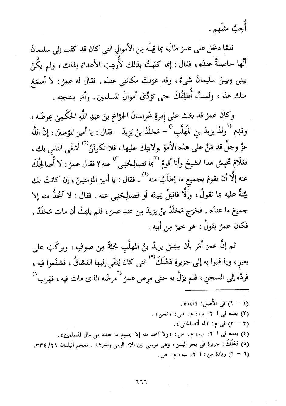 وَكَانَ عُمَرُ قَدْ بَعَثَ عَلَى إِمْرَةِ خُرَاسَانَ الْجَرَّاحَ بْنَ عَبْدِ اللَّهِ الْحَكَمِيَّ عِوَضَهُ وَقَدِمَ وَلَدُ يَزِيدَ بْنِ الْمُهَلَّبِ مَخْلَدُ بْنُ يَزِيدَ فَقَالَ: يَا أَمِيرَ الْمُؤْمِنِينَ إِنَّ اللَّهَ عَزَّ وَجَلَّ قَدْ مَنَّ عَلَى هَذِهِ الْأُمَّةِ بِوِلَايَتِكَ عَلَيْهَا فَلَا نَكُونَنَّ أَشْقَى النَّاسِ بِكَ، فَعَلَامَ تَحْبِسُ هَذَا الشَّيْخَ وَأَنَا أَقُومُ بِمَا تُصَالِحُنِي عَنْهُ؟ فَقَالَ عُمَرُ: لَا أُصَالِحُكَ عَنْهُ إِلَّا أَنْ تَقُومَ بِجَمِيعِ مَا يُطْلَبُ مِنْهُ. فَقَالَ: يَا أَمِيرَ الْمُؤْمِنِينَ إِنْ كَانَتْ لَكَ بَيِّنَةٌ عَلَيْهِ بِمَا تَقُولُ وَإِلَّا فَاقْبَلْ يَمِينَهُ أَوْ فَصَالِحْنِي عَنْهُ. فَقَالَ: لَا آخُذُ مِنْهُ إِلَّا جَمِيعَ مَا عِنْدَهُ، فَخَرَجَ مَخْلَدُ بْنُ يَزِيدَ مِنْ عِنْدِ عُمَرَ، فَلَمْ يَلْبَثْ أَنْ مَاتَ مَخْلَدٌ، فَكَانَ عُمَرُ يَقُولُ: هُوَ خَيْرٌ مِنْ أَبِيهِ.
