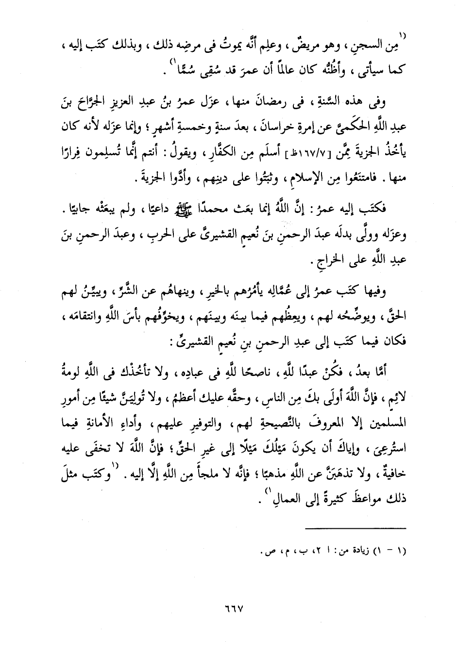 أَمَّا بَعْدُ، فَكُنْ عَبْدًا لِلَّهِ نَاصِحًا لِلَّهِ فِي عِبَادِهِ، وَلَا تَأْخُذْكَ فِي اللَّهِ لَوْمَةُ لَائِمٍ، فَإِنَّ اللَّهَ أَوْلَى بِكَ مِنَ النَّاسِ وَحَقَّهُ عَلَيْكَ أَعْظَمُ، وَلَا تُوَلِّيَنَّ شَيْئًا مِنْ أُمُورِ الْمُسْلِمِينَ إِلَّا الْمَعْرُوفَ بِالنَّصِيحَةِ لَهُمْ، وَالتَّوْفِيرِ عَلَيْهِمْ، وَأَدَاءِ الْأَمَانَةِ فِيمَا اسْتُرْعِيَ، وَإِيَّاكَ أَنْ يَكُونَ مَيْلُكَ مَيْلًا إِلَى غَيْرِ الْحَقِّ; فَإِنَّ اللَّهَ لَا تَخْفَى عَلَيْهِ خَافِيَةٌ وَلَا تَذْهَبَنَّ عَنِ اللَّهِ مَذْهَبًا; فَإِنَّهُ لَا مَلْجَأَ مِنَ اللَّهِ إِلَّا إِلَيْهِ. وَكَتَبَ مِثْلَ ذَلِكَ مَوَاعِظَ كَثِيرَةً إِلَى الْعُمَّالِ.