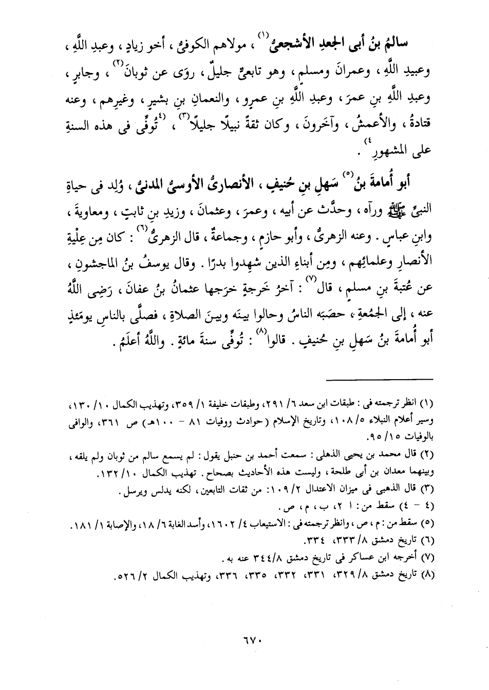 سَالِمُ بْنُ أَبِي الْجَعْدِ الْأَشْجَعِيُّ مَوْلَاهُمُ الْكُوفِيُّ أَخُو زِيَادٍ وَعَبْدُ اللَّهِ وَعُبَيْدُ اللَّهِ وَعِمْرَانُ وَمُسْلِمٌ، وَهُوَ تَابِعِيٌّ جَلِيلٌ رَوَى عَنْ ثَوْبَانَ وَجَابِرٍ وَعَبْدِ اللَّهِ بْنِ عُمَرَ وَعَبْدِ اللَّهِ بْنِ عَمْرٍو وَالنُّعْمَانِ بْنِ بَشِيرٍ وَغَيْرِهِمْ، وَعَنْهُ قَتَادَةُ وَالْأَعْمَشُ وَآخَرُونَ وَكَانَ ثِقَةً نَبِيلًا جَلِيلًا، تُوُفِّيَ فِي هَذِهِ السَّنَةِ عَلَى الْمَشْهُورِ.