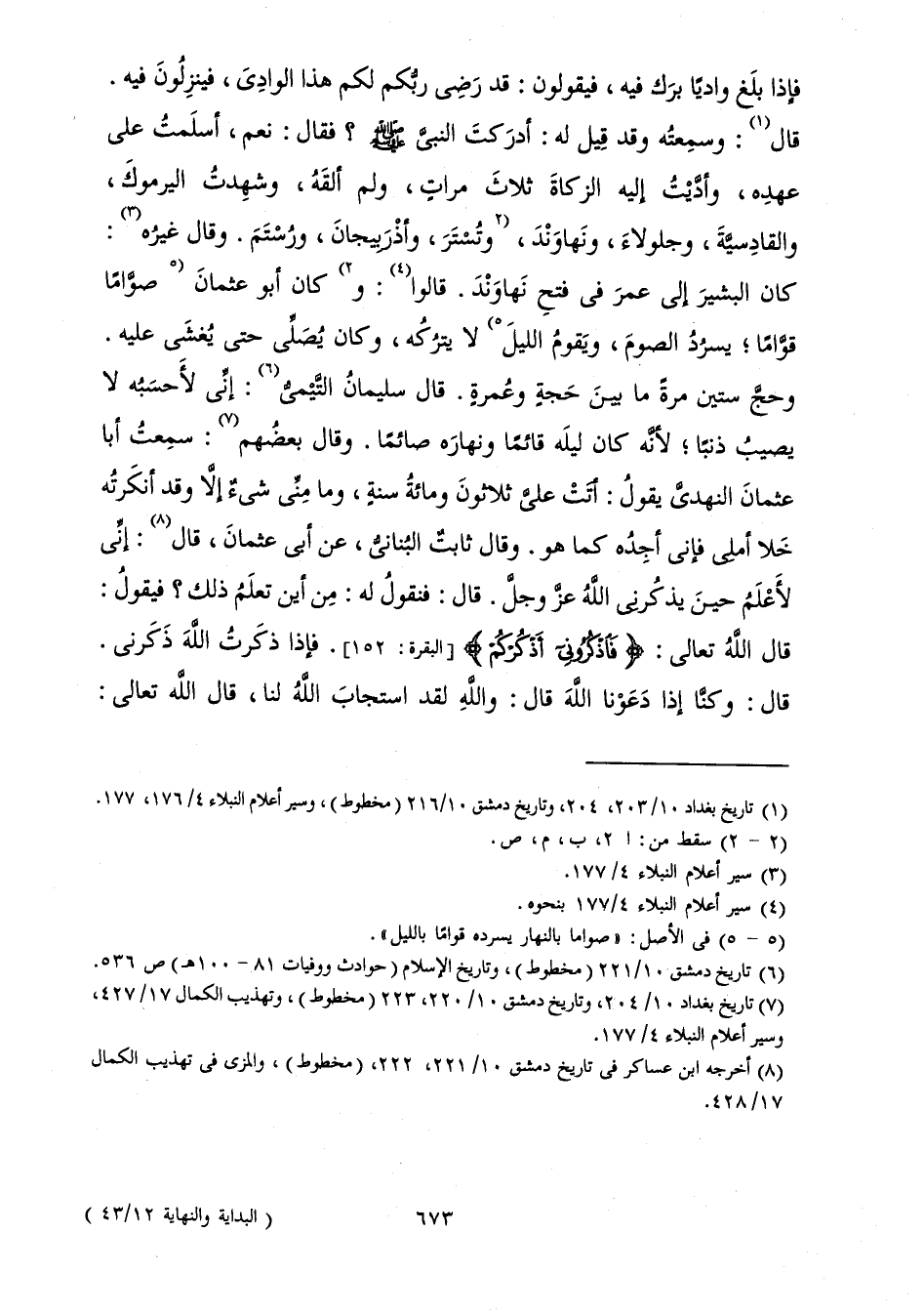 فَإِذَا بَلَغَ وَادِيَا بَرَكَ فِيهِ فَيَقُولُونَ: قَدْ رِضَى رَبُّكُمْ لَكُمْ هَذَا الْوَادِيَ فَيَنْزِلُونَ فِيهِ. قَالَ: وَسَمِعْتُهُ وَقَدْ قِيلَ لَهُ: أَدْرَكْتَ النَّبِيَّ صَلَّى اللَّهُ عَلَيْهِ وَسَلَّمَ؟ فَقَالَ: نَعَمْ أَسْلَمْتُ عَلَى عَهْدِهِ وَأَدَّيْتُ إِلَيْهِ الزَّكَاةَ ثَلَاثَ مَرَّاتٍ وَلَمْ أَلْقَهُ وَشَهِدْتُ الْيَرْمُوكَ وَالْقَادِسِيَّةَ وَجَلُولَاءَ وَنَهَاوَنْدَ وَتُسْتَرَ وَأَذْرَبِيجَانَ وَرُسْتُمْ. وَقَالَ غَيْرُهُ: كَانَ الْبَشِيرَ إِلَى عُمَرَ فِي فَتْحِ نَهَاوَنْدَ. قَالُوا: وَكَانَ أَبُو عُثْمَانَ صَوَّامًا قَوَّامًا; يَسْرُدُ الصَّوْمَ وَيَقُومُ اللَّيْلَ لَا يَتْرُكُهُ وَكَانَ يُصَلِّي حَتَّى يُغْشَى عَلَيْهِ. وَحَجَّ سِتِّينَ مَرَّةً مَا بَيْنَ حِجَّةٍ وَعُمْرَةٍ. قَالَ سُلَيْمَانُ التَّيْمِيُّ: إِنِّي لَأَحْسَبُهُ لَا يُصِيبُ ذَنْبًا; لِأَنَّهُ كَانَ لَيْلَهُ قَائِمًا وَنَهَارَهُ صَائِمًا. وَقَالَ بَعْضُهُمْ: سَمِعْتُ أَبَا عُثْمَانَ النَّهْدِيَّ يَقُولُ: أَتَتْ عَلَيَّ ثَلَاثُونَ وَمِائَةُ سَنَةٍ وَمَا مِنِّي شَيْءٌ إِلَّا وَقَدْ أَنْكَرْتُهُ خَلَا أَمَلِي فَإِنِّي أَجِدُهُ كَمَا هُوَ. وَقَالَ ثَابِتٌ الْبُنَانِيُّ عَنْ أَبِي عُثْمَانَ قَالَ: إِنِّي لَأَعْلَمُ حِينَ يَذْكُرُنِي اللَّهُ عَزَّ وَجَلَّ. قَالَ: فَنَقُولُ لَهُ: مِنْ أَيْنَ تَعْلَمُ ذَلِكَ؟ فَيَقُولُ: قَالَ اللَّهُ تَعَالَى: {فَاذْكُرُونِي أَذْكُرْكُمْ} [البقرة: 152] فَإِذَا ذَكَرْتُ اللَّهَ ذَكَرَنِي. قَالَ: وَكُنَّا إِذَا دَعَوْنَا اللَّهَ قَالَ: وَاللَّهِ لَقَدِ اسْتَجَابَ اللَّهُ لَنَا قَالَ اللَّهُ تَعَالَى: