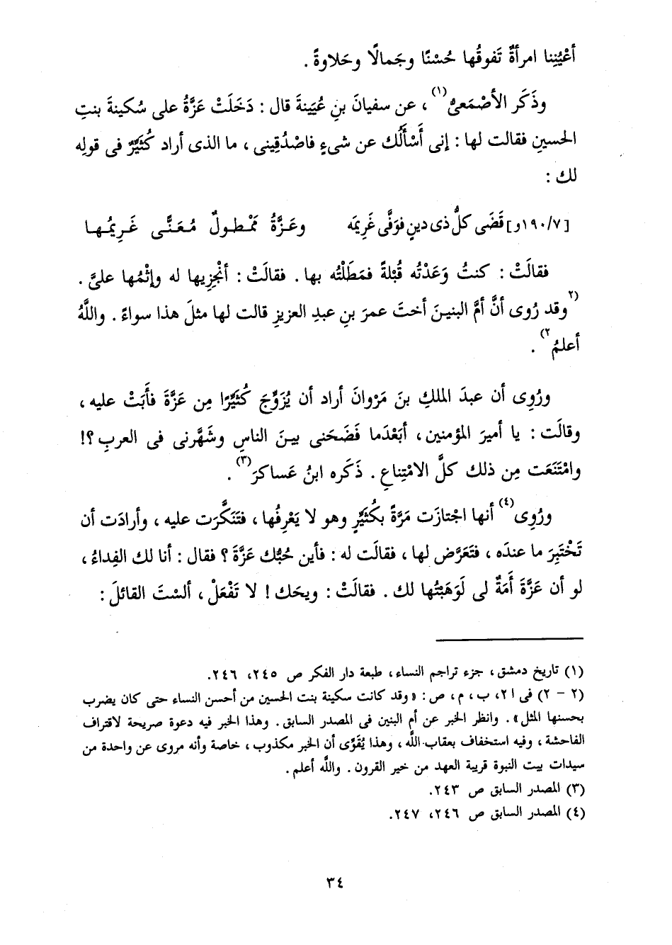 وَذَكَرَ الْأَصْمَعِيُّ، عَنْ سُفْيَانَ بْنِ عُيَيْنَةَ قَالَ: دَخَلَتْ عَزَّةُ عَلَى سُكَيْنَةَ بِنْتِ الْحُسَيْنِ فَقَالَتْ لَهَا: إِنِّي أَسْأَلُكِ عَنْ شَيْءٍ فَاصْدُقِينِي، مَا الَّذِي أَرَادَ كُثَيِّرُ فِي قَوْلِهِ لَكِ: