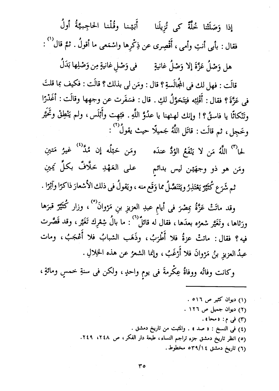 قَالَتْ: فَهَلْ لَكَ فِي الْمُجَالَسَةِ؟ قَالَ: وَمَنْ لِي بِذَلِكَ؟ قَالَتْ: فَكَيْفَ بِمَا قُلْتَ فِي عَزَّةَ؟ فَقَالَ: أُقْلِبُهُ فَيَتَحَوَّلُ لَكِ. قَالَ: فَسَفَرَتْ عَنْ وَجْهِهَا وَقَالَتْ: أَغَدْرًا وَتَنَكُاثًا يَا فَاسِقُ؟ ! وَإِنَّكَ لَهَاهُنَا يَا عَدُوَّ اللَّهِ. فَبُهِتَ وَأَبْلَسَ، وَلَمْ يَنْطِقْ وَتَحَيَّرَ وَخَجِلَ، ثُمَّ قَالَتْ: قَاتَلَ اللَّهُ جَمِيلًا حَيْثُ يَقُولُ: