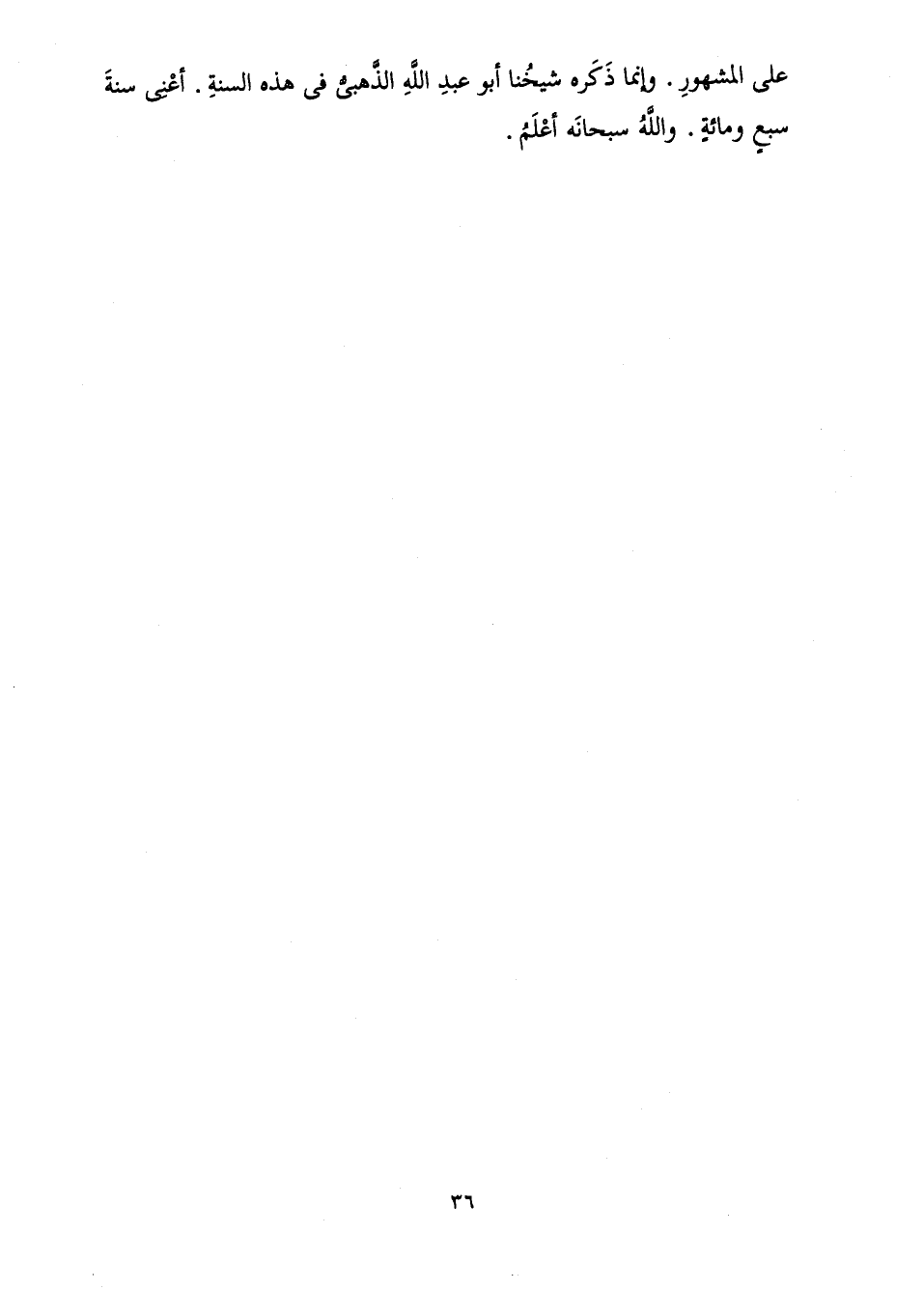 عَلَى الْمَشْهُورِ. وَإِنَّمَا ذَكَرَهُ شَيْخُنَا أَبُو عَبْدِ اللَّهِ الذَّهَبِيُّ فِي هَذِهِ السَّنَةِ. أَعْنِي سَنَةَ سَبْعٍ وَمِائَةٍ. وَاللَّهُ سُبْحَانَهُ أَعْلَمُ.