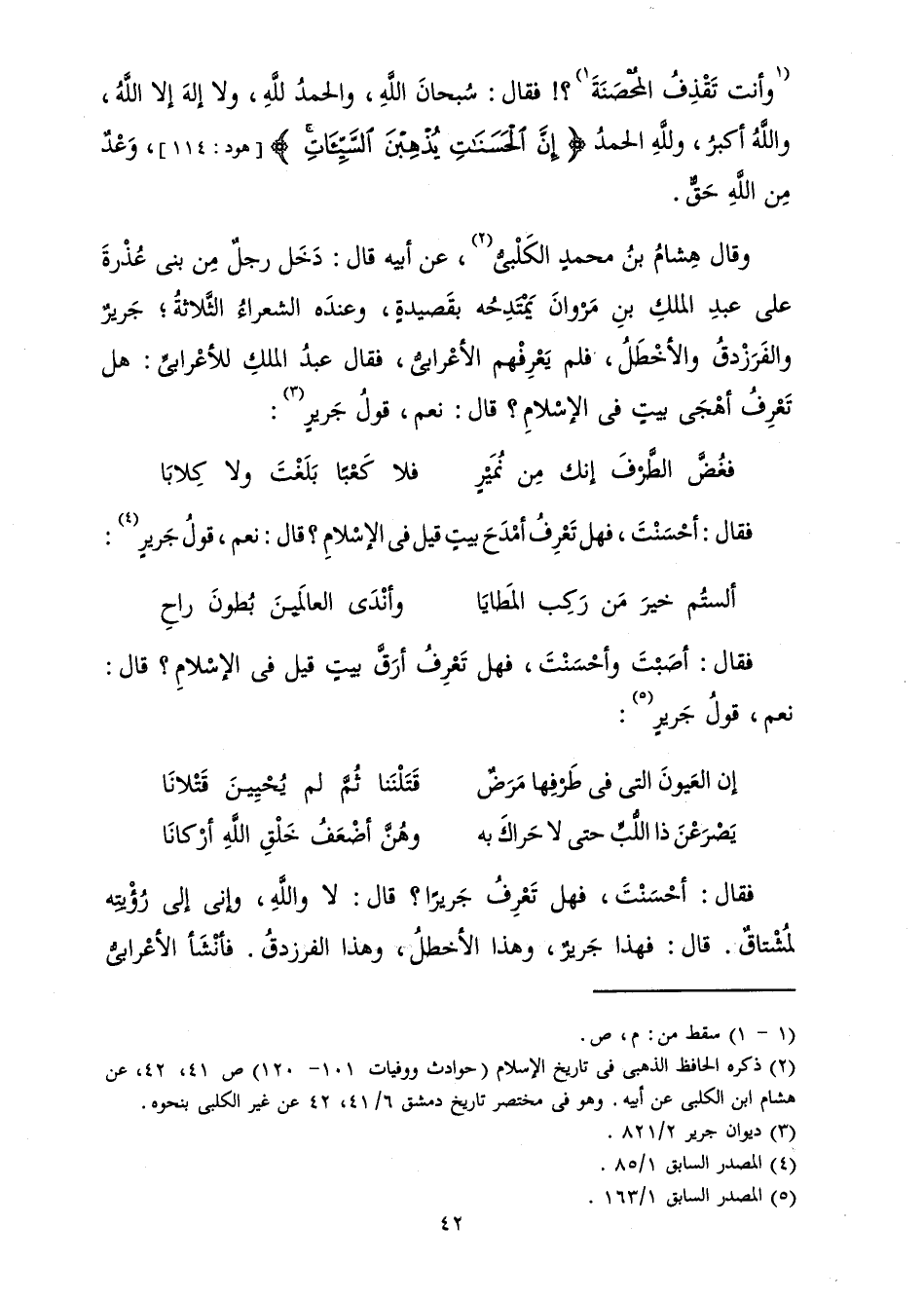 فَقَالَ: أَحْسَنْتَ، فَهَلْ تَعْرِفُ جَرِيرًا؟ قَالَ: لَا وَاللَّهِ وَإِنِّي إِلَى رُؤْيَتِهِ لَمُشْتَاقٌ. قَالَ: فَهَذَا جَرِيرٌ وَهَذَا الْأَخْطَلُ وَهَذَا الْفَرَزْدَقُ. فَأَنْشَأَ الْأَعْرَابِيُّ