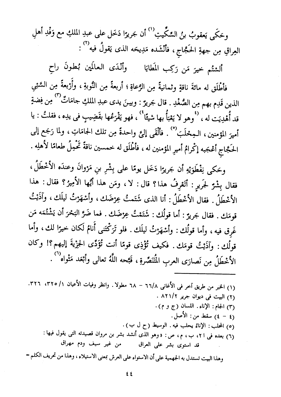 وَحَكَى نِفْطَوَيْهِ أَنَّ جَرِيرًا دَخَلَ يَوْمًا عَلَى بِشْرِ بْنِ مَرْوَانَ وَعِنْدَهُ الْأَخْطَلُ فَقَالَ بِشْرٌ لِجَرِيرٍ: أَتَعْرِفُ هَذَا؟ قَالَ: لَا، وَمَنْ هَذَا أَيُّهَا الْأَمِيرُ؟ فَقَالَ: هَذَا الْأَخْطَلُ. فَقَالَ الْأَخْطَلُ: أَنَا الَّذِي شَتَمْتُ عِرْضَكَ، وَأَسْهَرْتُ لَيْلَكَ، وَآذَيْتُ قَوْمَكَ. فَقَالَ جَرِيرٌ: أَمَّا قَوْلُكَ: شَتَمْتُ عِرْضَكَ. فَمَا ضَرَّ الْبَحْرَ أَنْ يَشْتُمَهُ مَنْ غَرِقَ فِيهِ، وَأَمَّا قَوْلُكَ: وَأَسْهَرْتُ لَيْلَكَ. فَلَوْ تَرَكْتَنِي أَنَامُ لَكَانَ خَيْرًا لَكَ، وَأَمَّا قَوْلُكَ: وَآذَيْتُ قَوْمَكَ. فَكَيْفَ تُؤْذِي قَوْمًا أَنْتَ تُؤَدِّي الْجِزْيَةَ إِلَيْهِمْ؟ ! وَكَانَ الْأَخْطَلُ مِنْ نَصَارَى الْعَرَبِ الْمُتَنَصِّرَةِ، قَبَّحَهُ اللَّهُ وَأَبْعَدَ مَثْوَاهُ.