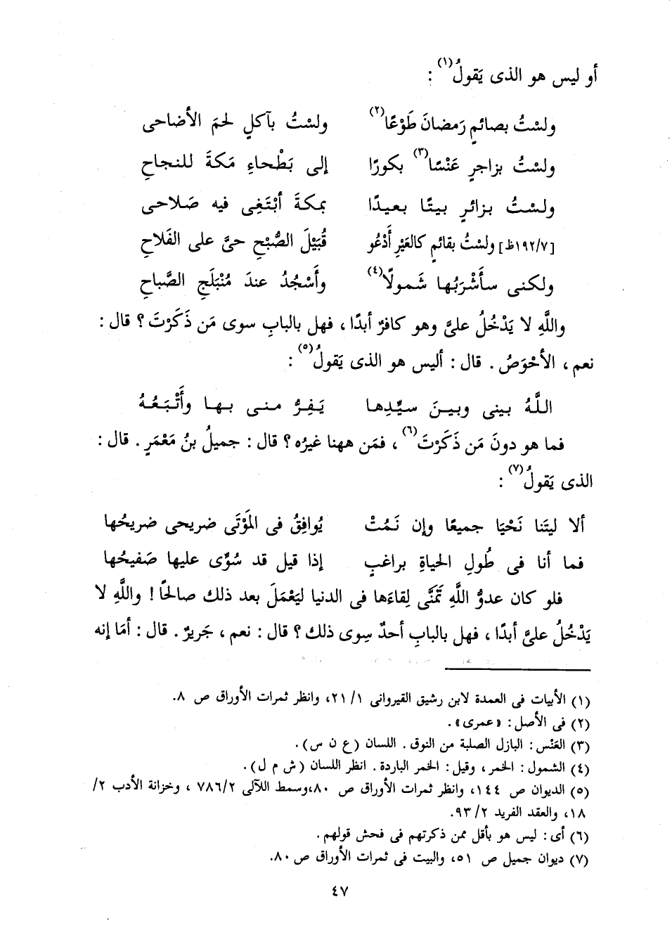فَمَا هُوَ دُونَ مَنْ ذَكَرْتَ، فَمَنْ هَاهُنَا غَيْرُهُ؟ قَالَ: جَمِيلُ بْنُ مَعْمَرٍ. قَالَ: الَّذِي يَقُولُ: