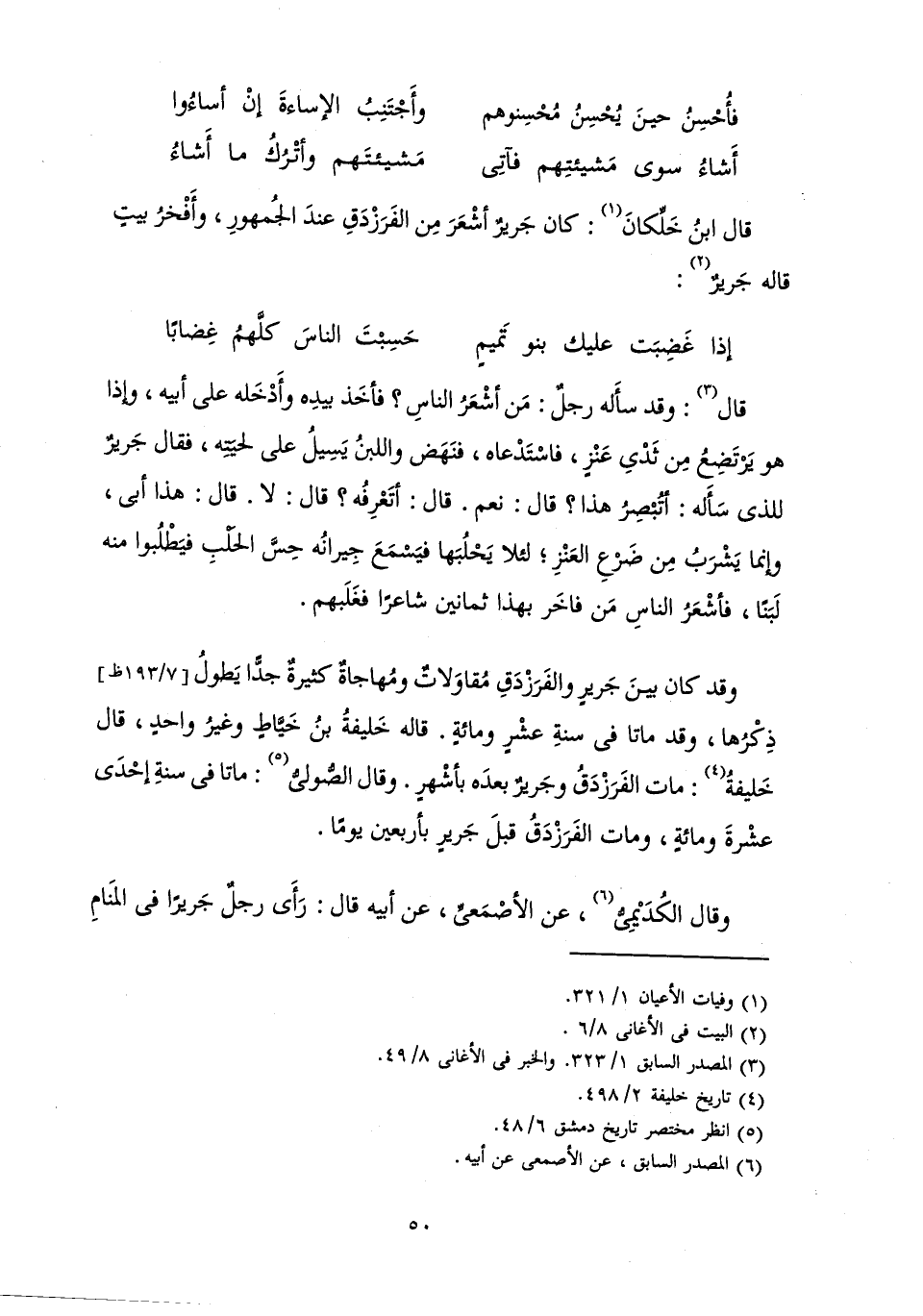 وَقَدْ كَانَ بَيْنَ جَرِيرٍ، وَالْفَرَزْدَقِ مُقَاوَلَاتٌ وَمُهَاجَاةٌ كَثِيرَةٌ جِدًّا يَطُولُ ذِكْرُهَا، وَقَدْ مَاتَ فِي سَنَةِ عَشْرٍ وَمِائَةٍ. قَالَهُ خَلِيفَةُ بْنُ خَيَّاطٍ وَغَيْرُ وَاحِدٍ، قَالَ خَلِيفَةُ: مَاتَ الْفَرَزْدَقُ، وَجَرِيرٌ بَعْدَهُ بِأَشْهُرٍ. وَقَالَ الصُّولِيُّ: مَاتَا فِي سَنَةِ إِحْدَى عَشْرَةَ وَمِائَةٍ، وَمَاتَ الْفَرَزْدَقُ قَبْلَ جَرِيرٍ بِأَرْبَعِينَ يَوْمًا.