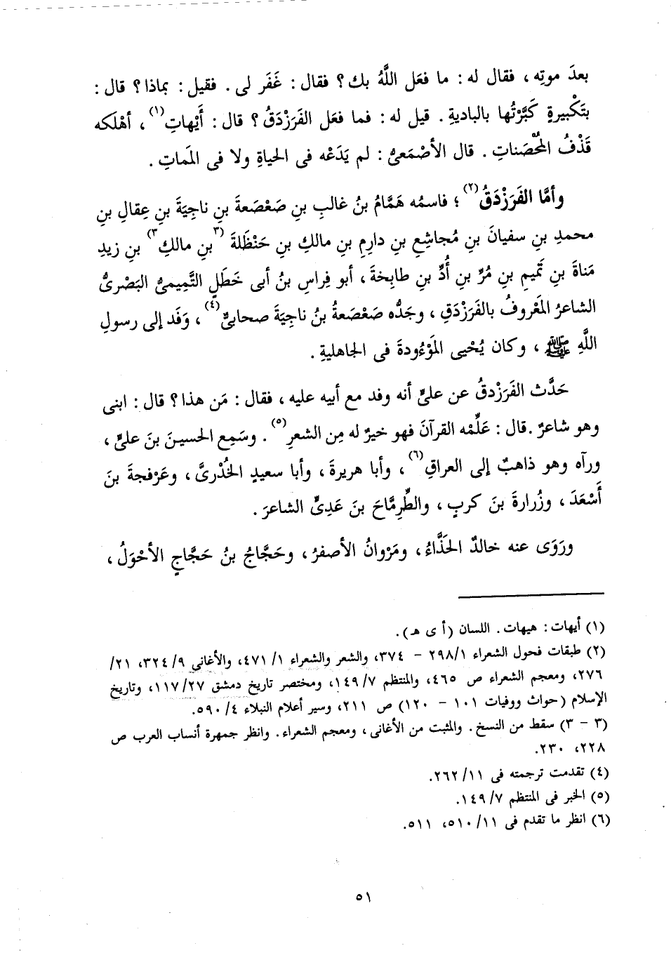 فَاسْمُهُ هَمَّامُ بْنُ غَالِبِ بْنِ صَعْصَعَةَ بْنِ نَاجِيَةَ بْنِ عِقَالِ بْنِ مُحَمَّدِ بْنِ سُفْيَانَ بْنِ مُجَاشِعِ بْنِ دَارِمِ بْنِ مَالِكِ بْنِ حَنْظَلَةَ بْنِ مَالِكِ بْنِ زَيْدِ مَنَاةَ بْنِ تَمِيمِ بْنِ مُرِّ بْنِ أُدِّ بْنِ طَابِخَةَ، أَبُو فِرَاسِ بْنُ أَبِي خَطَلٍ التَّمِيمِيُّ الْبَصْرِيُّ الشَّاعِرُ الْمَعْرُوفُ بِالْفَرَزْدَقِ، وَجَدُّهُ صَعْصَعَةُ بْنُ نَاجِيَةَ صَحَابِيٌّ، وَفَدَ إِلَى رَسُولِ اللَّهِ صَلَّى اللَّهُ عَلَيْهِ وَسَلَّمَ، وَكَانَ يُحْيِي الْمَوْءُودَةَ فِي الْجَاهِلِيَّةِ.