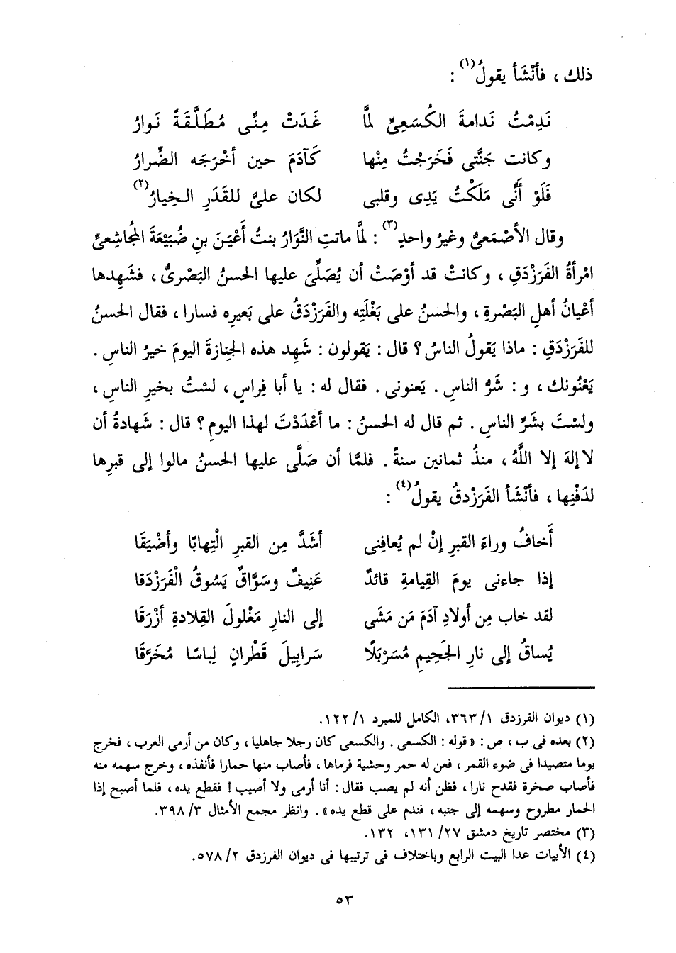 إِذَا جَاءَنِي يَوْمَ الْقِيَامَةِ قَائِدٌ ... عَنِيفٌ وَسَوَّاقٌ يَسُوقُ الْفَرَزْدَقَا