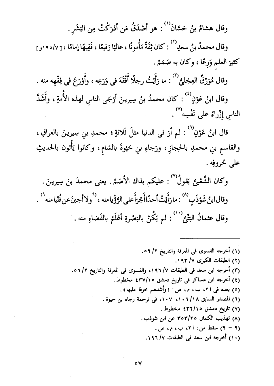 قَالَ ابْنُ عَوْنٍ: لَمْ أَرَ فِي الدُّنْيَا مِثْلَ ثَلَاثَةٍ مُحَمَّدِ بْنِ سِيرِينَ بِالْعِرَاقِ وَالْقَاسِمِ بْنِ مُحَمَّدٍ بِالْحِجَازِ وَرَجَاءِ بْنِ حَيْوَةَ بِالشَّامِ وَكَانُوا يَأْتُونَ بِالْحَدِيثِ عَلَى حُرُوفِهِ.