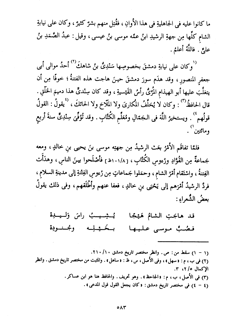 وَكَانَ عَلَى نِيَابَةِ دِمَشْقَ بِخُصُوصِهَا سِنْدِيُّ بْنُ شَاهَكَ أَحَدُ مَوَالِي أَبِي جَعْفَرٍ الْمَنْصُورِ، وَقَدْ هَدَمَ سُورَ دِمَشْقَ حِينَ هَاجَتْ هَذِهِ الْفِتْنَةُ; خَوْفًا مِنْ أَنْ يَتَغَلَّبَ عَلَيْهَا أَبُو الْهَيْذَامِ الْمُرِّيُّ رَأْسُ الْقَيْسِيَّةِ، وَقَدْ كَانَ سِنْدِيٌّ هَذَا دَمِيمَ الْخَلْقِ. قَالَ الْحَافِظُ: وَكَانَ لَا يُحَلِّفُ الْمُكَارِي وَلَا الْمَلَّاحَ وَلَا الْحَائِكَ، يَقُولُ: الْقَوْلُ قَوْلُهُمْ. وَيَسْتَخِيرُ اللَّهَ فِي الْجَمَّالِ وَمُعَلِّمِ الْكُتَّابِ. وَقَدْ تُوُفِّيَ سِنْدِيٌّ سَنَةَ أَرْبَعٍ وَمِائَتَيْنِ.