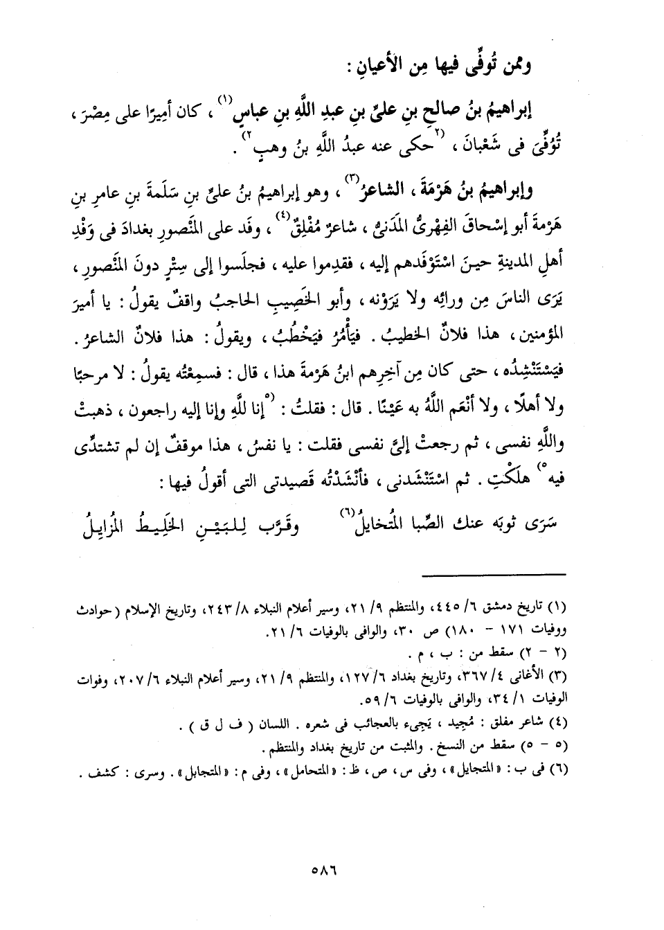 وَإِبْرَاهِيمُ بْنُ هَرْمَةَ، الشَّاعِرُ، وَهُوَ إِبْرَاهِيمُ بْنُ عَلِيِّ بْنِ سَلَمَةَ بْنِ عَامِرِ بْنِ هَرْمَةَ أَبُو إِسْحَاقَ الْفِهْرِيُّ الْمَدَنِيُّ، شَاعِرٌ مُفَلِّقٌ، وَفَدَ عَلَى الْمَنْصُورِ بَغْدَادَ فِي وَفْدٍ مِنْ أَهْلِ الْمَدِينَةِ حِينَ اسْتَوْفَدَهُمْ إِلَيْهِ، فَقَدِمُوا عَلَيْهِ، فَجَلَسُوا إِلَى سِتْرٍ دُونَ الْمَنْصُورِ، يَرَى النَّاسَ مِنْ وَرَائِهِ وَلَا يَرَوْنَهُ، وَأَبُو الْخَصِيبِ الْحَاجِبُ وَاقِفٌ يَقُولُ: يَا أَمِيرَ الْمُؤْمِنِينَ، هَذَا فُلَانٌ الْخَطِيبُ. فَيَأْمُرُهُ فَيَخْطُبُ، وَيَقُولُ: هَذَا فُلَانٌ الشَّاعِرُ. فَيَسْتَنْشِدُهُ، حَتَّى كَانَ مِنْ آخِرِهِمْ ابْنُ هَرْمَةَ هَذَا، قَالَ: فَسَمِعْتُهُ يَقُولُ: لَا مَرْحَبًا وَلَا أَهْلًا، وَلَا أَنْعَمَ اللَّهُ بِهِ عَيْنًا. قَالَ: فَقُلْتُ: إِنَّا لِلَّهِ وَإِنَّا إِلَيْهِ رَاجِعُونَ، ذَهَبَتْ وَاللَّهِ نَفْسِي، ثُمَّ رَجَعَتْ إِلَيَّ نَفْسِي فَقُلْتُ: يَا نَفْسُ، هَذَا مَوْقِفٌ إِنْ لَمْ تَشْتَدِّي فِيهِ هَلَكْتِ. ثُمَّ اسْتَنْشَدَنِي، فَأَنْشَدْتُهُ قَصِيدَتِي الَّتِي أَقُولُ فِيهَا: