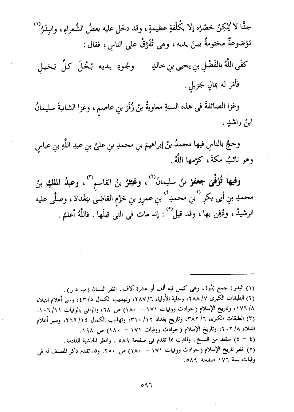 وَفِيهَا تُوُفِّيَ جَعْفَرُ بْنُ سُلَيْمَانَ، وَعَبْثَرُ بْنُ الْقَاسِمِ، وَعَبْدُ الْمَلِكِ بْنُ مُحَمَّدِ بْنِ أَبِي بَكْرِ بْنِ مُحَمَّدِ بْنِ عَمْرِو بْنِ حَزْمٍ الْقَاضِي بِبَغْدَادَ، وَصَلَّى عَلَيْهِ الرَّشِيدُ، وَدُفِنَ بِهَا، وَقَدْ قِيلَ: إِنَّهُ مَاتَ فِي الَّتِي قَبْلَهَا. فَاللَّهُ أَعْلَمُ.