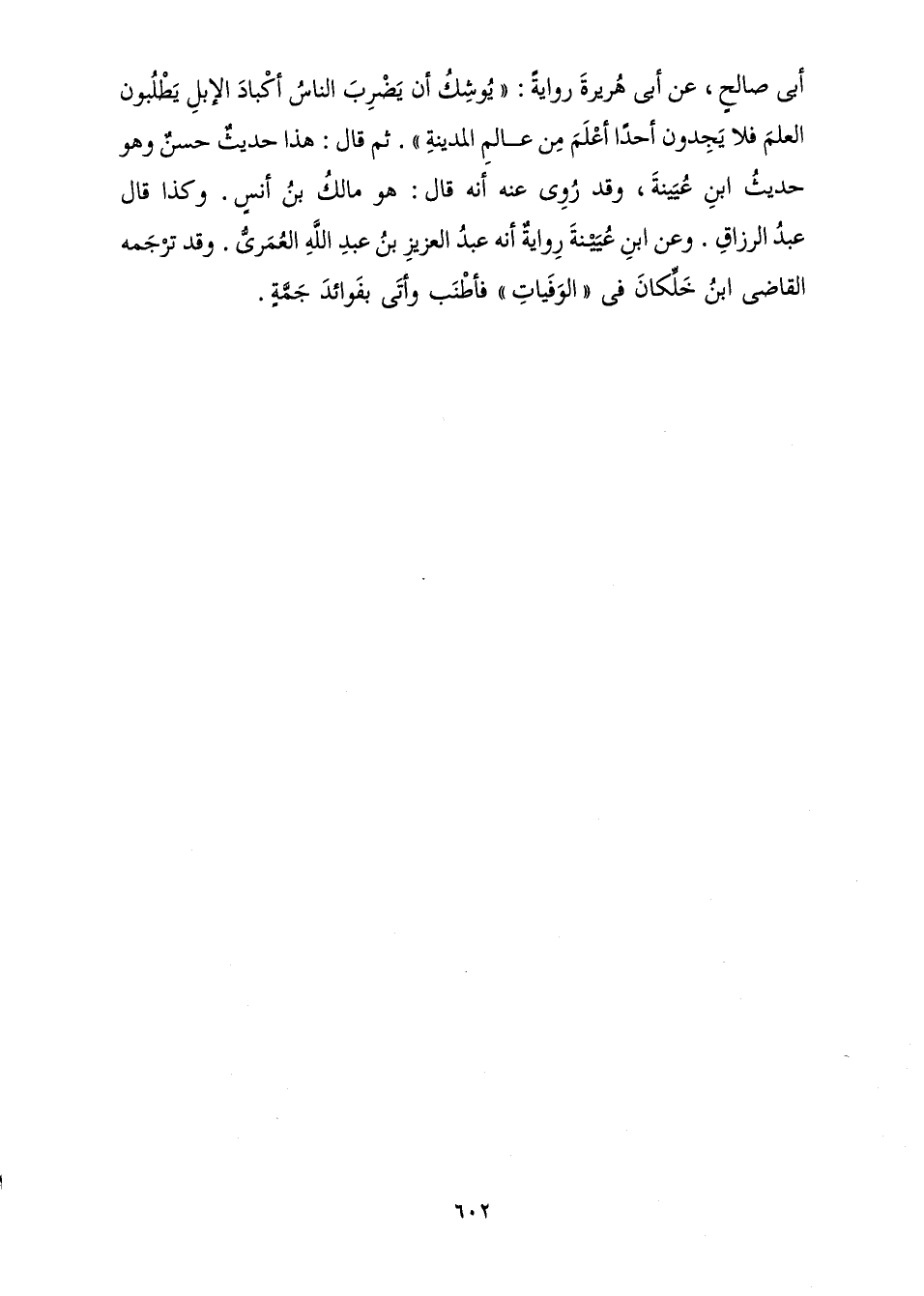 أَبِي صَالِحٍ، عَنْ أَبِي هُرَيْرَةَ رِوَايَةَ: " «يُوشِكُ أَنْ يَضْرِبَ النَّاسُ أَكْبَادَ الْإِبِلِ يَطْلُبُونَ الْعِلْمَ فَلَا يَجِدُونَ أَحَدًا أَعْلَمَ مِنْ عَالِمِ الْمَدِينَةِ» ". ثُمَّ قَالَ: هَذَا حَدِيثٌ حَسَنٌ وَهُوَ حَدِيثُ ابْنِ عُيَيْنَةَ، وَقَدْ رُوِيَ عَنْهُ أَنَّهُ قَالَ: هُوَ مَالِكُ بْنُ أَنَسٍ وَكَذَا قَالَ عَبْدُ الرَّزَّاقِ. وَعَنِ ابْنِ عُيَيْنَةَ رِوَايَةٌ أَنَّهُ عَبْدُ الْعَزِيزِ بْنُ عَبْدِ اللَّهِ الْعُمَرِيُّ. وَقَدْ تَرْجَمَهُ الْقَاضِي ابْنُ خِلِّكَانَ فِي " الْوَفَيَاتِ " فَأَطْنَبَ وَأَتَى بِفَوَائِدَ جَمَّةٍ.