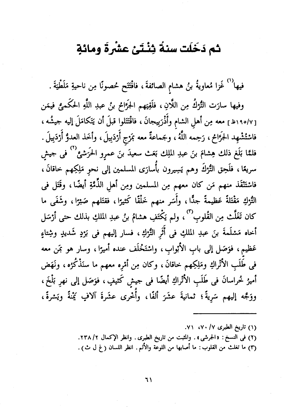 وَفِيهَا سَارَتِ التُّرْكُ مِنَ اللَّانِ فَلَقِيَهُمُ الْجَرَّاحُ بْنُ عَبْدِ اللَّهِ الْحَكَمِيُّ فِيمَنْ مَعَهُ مِنْ أَهْلِ الشَّامِ وَأَذْرَبِيجَانَ فَاقْتَتَلُوا قَبْلَ أَنْ يَتَكَامَلَ إِلَيْهِ جَيْشُهُ، فَاسْتُشْهِدَ الْجَرَّاحُ، رَحِمَهُ اللَّهُ، وَجَمَاعَةٌ مَعَهُ بِمَرْجِ أَرْدَبِيلَ وَأَخَذَ الْعَدُوُّ أَرْدَبِيلَ. فَلَمَّا بَلَغَ ذَلِكَ هِشَامَ بْنَ عَبْدِ الْمَلِكِ بَعَثَ سَعِيدَ بْنَ عَمْرٍو الْحَرَشِيَّ فِي جَيْشٍ سَرِيعًا، فَلَحِقَ التُّرْكَ وَهُمْ يَسِيرُونَ بِأُسَارَى الْمُسْلِمِينَ إِلَى نَحْوِ مِلْكِهِمْ خَاقَانَ، فَاسْتَنْقَذَ مِنْهُمْ مَنْ كَانَ مَعَهُمْ مِنَ الْمُسْلِمِينَ وَمِنْ أَهْلِ الذِّمَّةِ أَيْضًا، وَقَتَلَ فِي التُّرْكِ مَقْتَلَةً عَظِيمَةً جِدًّا، وَأَسَرَ مِنْهُمْ خَلْقًا كَثِيرًا، فَقَتَلَهُمْ صَبْرًا، وَشَفَى مَا كَانَ تَغَلَّثَ مِنَ الْقُلُوبِ، وَلَمْ يَكْتَفِ هِشَامُ بْنُ عَبْدِ الْمَلِكِ بِذَلِكَ حَتَّى أَرْسَلَ أَخَاهُ مَسْلَمَةَ بْنَ عَبْدِ الْمَلِكِ فِي أَثَرِ التُّرْكِ فَسَارَ إِلَيْهِمْ فِي بَرْدٍ شَدِيدٍ وَشِتَاءٍ عَظِيمٍ، فَوَصَلَ إِلَى بَابِ الْأَبْوَابِ، وَاسْتَخْلَفَ عِنْدَهُ أَمِيرًا، وَسَارَ هُوَ بِمَنْ مَعَهُ فِي طَلَبِ الْأَتْرَاكِ وَمَلِكِهِمْ خَاقَانَ، وَكَانَ مِنْ أَمْرِهِ مَعَهُمْ مَا سَنَذْكُرُهُ، وَنَهَضَ أَمِيرُ خُرَاسَانَ فِي طَلَبِ الْأَتْرَاكِ أَيْضًا فِي جَيْشٍ كَثِيفٍ، فَوَصَلَ إِلَى نَهْرِ بَلْخَ وَوَجَّهَ إِلَيْهِمْ سِرِّيَّةً ; ثَمَانِيَةَ عَشَرَ أَلْفًا، وَأُخْرَى عَشَرَةَ آلَافٍ يُمْنَةً وَيُسْرَةً،
