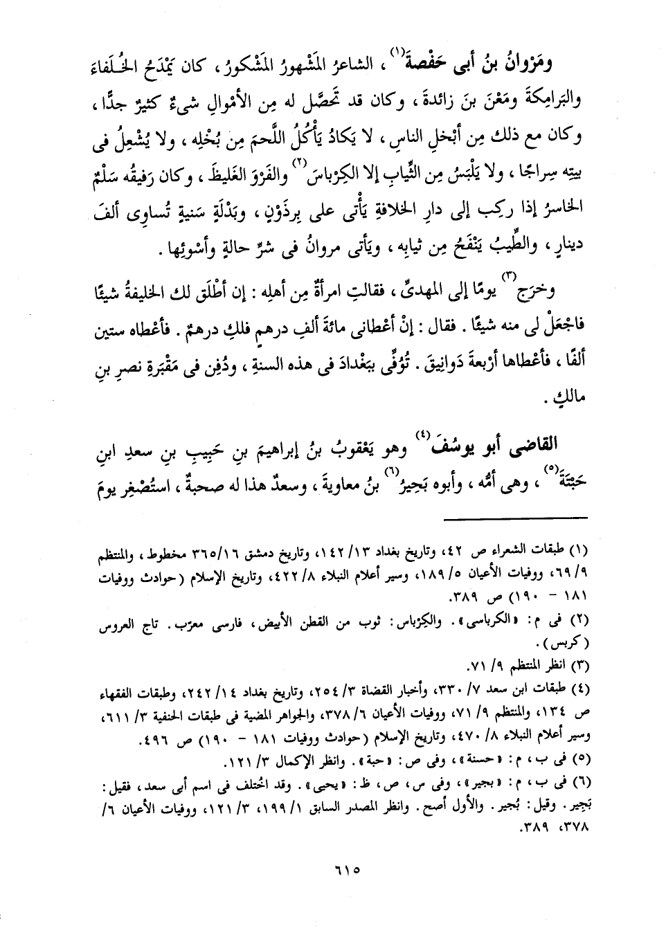 وَمَرْوَانُ بْنُ أَبِي حَفْصَةَ، الشَّاعِرُ الْمَشْهُورُ الْمَشْكُورُ، كَانَ يَمْدَحُ الْخُلَفَاءَ وَالْبَرَامِكَةَ وَمَعْنَ بْنَ زَائِدَةَ، وَكَانَ قَدْ تَحَصَّلَ لَهُ مِنَ الْأَمْوَالِ شَيْءٌ كَثِيرٌ جِدًّا، وَكَانَ مَعَ ذَلِكَ مِنْ أَبْخَلِ النَّاسِ، لَا يَكَادُ يَأْكُلُ اللَّحْمَ مِنْ بُخْلِهِ، وَلَا يُشْعِلُ فِي بَيْتِهِ سِرَاجًا، وَلَا يَلْبَسُ مِنَ الثِّيَابِ إِلَّا الْكِرْبَاسَ وَالْفَرْوَ الْغَلِيظَ، وَكَانَ رَفِيقُهُ سَلْمٌ الْخَاسِرُ إِذَا رَكِبَ إِلَى دَارِ الْخِلَافَةِ يَأْتِي عَلَى بِرْذَوْنٍ، وَبَدْلَةٍ سَنِيَّةٍ تُسَاوِي أَلْفَ دِينَارٍ، وَالطِّيبُ يَنْفُحُ مِنْ ثِيَابِهِ، وَيَأْتِي مَرْوَانَ فِي شَرِّ حَالَةٍ وَأَسْوَئِهَا.