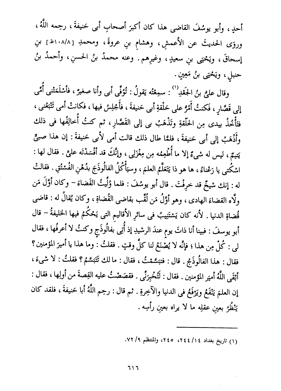قَالَ عَلِيُّ بْنُ الْجَعْدِ: سَمِعْتُهُ يَقُولُ: تُوُفِّيَ أَبِي وَأَنَا صَغِيرٌ، فَأَسْلَمَتْنِي أُمِّي إِلَى قَصَّارٍ، فَكُنْتُ أَمُرُّ عَلَى حَلْقَةِ أَبِي حَنِيفَةَ، فَأَجْلِسُ فِيهَا، فَكَانَتْ أُمِّي تَتْبَعُنِي، فَتَأْخُذُ بِيَدِي مِنَ الْحَلْقَةِ وَتَذْهَبُ بِي إِلَى الْقَصَّارِ، ثُمَّ كُنْتُ أُخَالِفُهَا فِي ذَلِكَ وَأَذْهَبُ إِلَى أَبِي حَنِيفَةَ، فَلَمَّا طَالَ ذَلِكَ قَالَتْ أُمِّي لِأَبِي حَنِيفَةَ: إِنَّ هَذَا صَبِيٌّ يَتِيمٌ، لَيْسَ لَهُ شَيْءٌ إِلَّا مَا أُطْعِمُهُ مِنْ مِغْزَلِي، وَإِنَّكَ قَدْ أَفْسَدْتَهُ عَلَيَّ. فَقَالَ لَهَا: اسْكُتِي يَا رَعْنَاءُ، هَا هُوَ ذَا يَتَعَلَّمُ الْعِلْمَ، وَسَيَأْكُلُ الْفَالَوْذَجَ بِدُهْنِ الْفُسْتُقِ. فَقَالَتْ لَهُ: إِنَّكَ شَيْخٌ قَدْ خَرِفْتَ. قَالَ أَبُو يُوسُفَ: فَلَمَّا وَلِيتُ الْقَضَاءَ - وَكَانَ أَوَّلَ مَنْ وَلَّاهُ الْقَضَاءَ الْهَادِي، وَهُوَ أَوَّلُ مَنْ لُقِّبَ بِقَاضِي الْقُضَاةِ، وَكَانَ يُقَالُ لَهُ: قَاضِي قُضَاةِ الدُّنْيَا. لِأَنَّهُ كَانَ يَسْتَنِيبُ فِي سَائِرِ الْأَقَالِيمِ الَّتِي يَحْكُمُ فِيهَا الْخَلِيفَةُ - قَالَ أَبُو يُوسُفَ: فَبَيْنَا أَنَا ذَاتَ يَوْمٍ عِنْدَ الرَّشِيدِ إِذْ أُتِيَ بِفَالَوْذَجَ وَكُنْتُ لَا أَعْرِفُهَا، فَقَالَ لِي: كُلْ مِنْ هَذَا; فَإِنَّهُ لَا يُصْنَعُ لَنَا كُلَّ وَقْتٍ. فَقُلْتُ: وَمَا هَذَا يَا أَمِيرَ الْمُؤْمِنِينَ؟ فَقَالَ: هَذَا الْفَالَوْذَجُ. قَالَ: فَتَبَسَّمْتُ، فَقَالَ: مَا لَكَ تَتَبَسَّمُ؟ فَقُلْتُ: لَا شَيْءَ، أَبْقَى اللَّهُ أَمِيرَ الْمُؤْمِنِينَ. فَقَالَ: لَتُخْبِرَنِّي: فَقَصَصْتُ عَلَيْهِ الْقِصَّةَ مِنْ أَوَّلِهَا، فَقَالَ: إِنَّ الْعِلْمَ يَنْفَعُ وَيَرْفَعُ فِي الدُّنْيَا وَالْآخِرَةِ. ثُمَّ قَالَ: رَحِمَ اللَّهُ أَبَا حَنِيفَةَ، فَلِقَدْ كَانَ يَنْظُرُ بِعَيْنِ عَقْلِهِ مَا لَا يَرَاهُ بِعَيْنِ رَأْسِهِ.