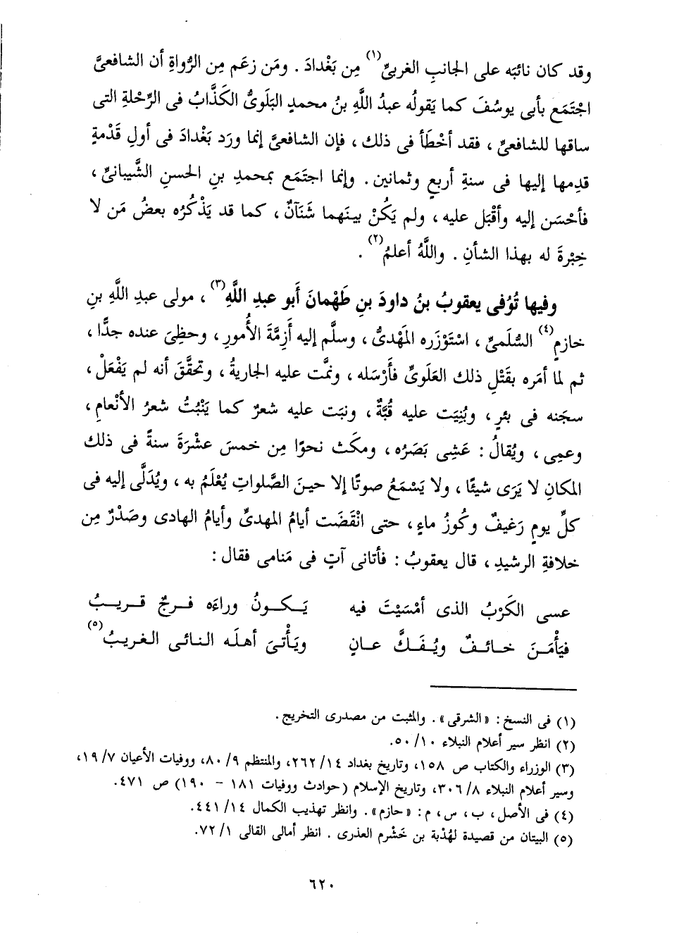 وَفِيهَا تُوُفِّيَ يَعْقُوبُ بْنُ دَاوُدَ بْنِ طَهْمَانَ أَبُو عَبْدِ اللَّهِ، مَوْلَى عَبْدِ اللَّهِ بْنِ خَازِمٍ السُّلَمِيِّ، اسْتَوْزَرَهُ الْمَهْدِيُّ، وَسَلَّمَ إِلَيْهِ أَزِمَّةَ الْأُمُورِ، وَحَظِيَ عِنْدَهُ جِدًّا، ثُمَّ لَمَّا أَمَرَهُ بِقَتْلِ ذَلِكَ الْعَلَوِيِّ فَأَرْسَلَهُ، وَنَمَّتْ عَلَيْهِ الْجَارِيَةُ، وَتَحَقَّقَ أَنَّهُ لَمْ يَفْعَلْ، سَجَنَهُ فِي بِئْرٍ، وَبُنِيَتْ عَلَيْهِ قُبَّةٌ، وَنَبَتَ عَلَيْهِ شَعْرٌ كَمَا يَنْبُتُ شَعْرُ الْأَنْعَامِ، وَعَمِيَ، وَيُقَالُ: عَشِيَ بَصَرُهُ، وَمَكَثَ نَحْوًا مِنْ خَمْسَ عَشْرَ سَنَةً فِي ذَلِكَ الْمَكَانِ لَا يَرَى شَيْئًا، وَلَا يَسْمَعُ صَوْتًا إِلَّا حِينَ الصَّلَوَاتِ يُعْلَمُ بِهِ، وَيُدَلَّى إِلَيْهِ فِي كُلِّ يَوْمٍ رَغِيفٌ وَكُوزُ مَاءٍ، حَتَّى انْقَضَتْ أَيَّامُ الْمَهْدِيِّ وَأَيَّامُ الْهَادِي وَصَدْرٌ مِنْ خِلَافَةِ الرَّشِيدِ، قَالَ يَعْقُوبُ: فَأَتَانِي آتٍ فِي مَنَامِي فَقَالَ: