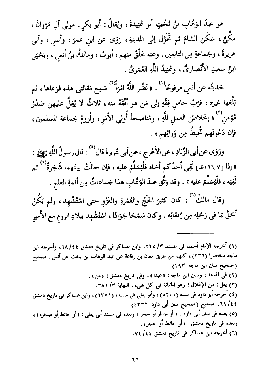 وَرَوَى عَنْ أَبِي الزِّنَادِ عَنِ الْأَعْرَجِ، عَنْ أَبِي هُرَيْرَةَ قَالَ: قَالَ رَسُولُ اللَّهِ صَلَّى اللَّهُ عَلَيْهِ وَسَلَّمَ: «إِذَا لَقِيَ أَحَدُكُمْ أَخَاهُ فَلْيُسَلِّمْ عَلَيْهِ، فَإِنْ حَالَتْ بَيْنَهُمَا شَجَرَةٌ ثُمَّ لَقِيَهُ، فَلْيُسَلِّمْ عَلَيْهِ» . وَقَدْ وَثَّقَ عَبْدَ الْوَهَّابِ هَذَا جَمَاعَاتٌ مِنْ أَئِمَّةِ الْعِلْمِ.