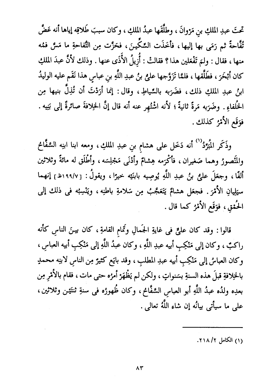 قَالُوا: وَقَدْ كَانَ عَلِيٌّ فِي غَايَةِ الْجَمَالِ وَتَمَامِ الْقَامَةِ، كَانَ بَيْنَ النَّاسِ كَأَنَّهُ رَاكِبٌ، وَكَانَ إِلَى مَنْكِبِ أَبِيهِ عَبْدِ اللَّهِ وَكَانَ عَبْدُ اللَّهِ إِلَى مَنْكِبِ أَبِيهِ الْعَبَّاسِ وَكَانَ الْعَبَّاسُ إِلَى مَنْكِبِ أَبِيهِ عَبْدِ الْمُطَّلِبِ وَقَدْ بَايَعَ كَثِيرٌ مِنَ النَّاسِ لِابْنِهِ مُحَمَّدٍ بِالْخِلَافَةِ قَبْلَ هَذِهِ السَّنَةِ بِسَنَوَاتٍ، وَلَكِنْ لَمْ يَظْهَرْ أَمْرُهُ حَتَّى مَاتَ، فَقَامَ بِالْأَمْرِ مِنْ بَعْدِهِ وَلَدُهُ عَبْدُ اللَّهِ أَبُو الْعَبَّاسِ السَّفَّاحُ وَكَانَ ظُهُورُهُ فِي سَنَةِ ثِنْتَيْنِ وَثَلَاثِينَ، عَلَى مَا سَيَأْتِي بَيَانُهُ إِنْ شَاءَ اللَّهُ تَعَالَى.