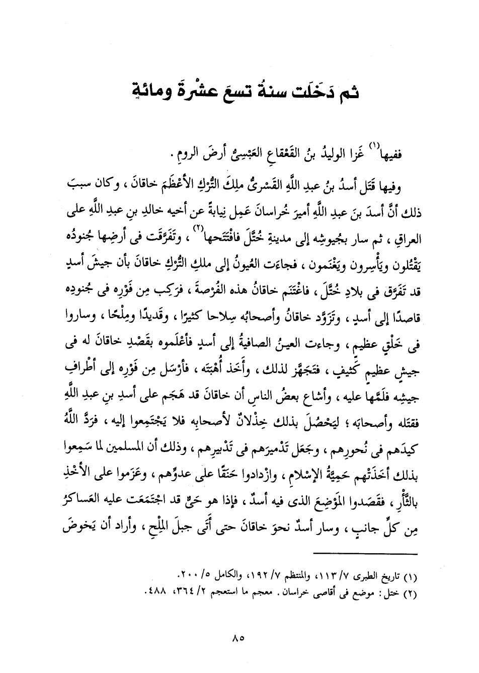 وَفِيهَا قَتَلَ أَسَدُ بْنُ عَبْدِ اللَّهِ الْقَسْرِيُّ مَلِكَ التُّرْكِ الْأَعْظَمَ خَاقَانَ، وَكَانَ سَبَبُ ذَلِكَ أَنَّ أَسَدَ بْنَ عَبْدِ اللَّهِ أَمِيرَ خُرَاسَانَ عَمِلَ نِيَابَةً عَنْ أَخِيهِ خَالِدِ بْنِ عَبْدِ اللَّهِ عَلَى الْعِرَاقِ ثُمَّ سَارَ بِجُيُوشِهِ إِلَى مَدِينَةِ خُتَّلَ فَافْتَتَحَهَا، وَتَفَرَّقَتْ فِي أَرْضِهَا جُنُودُهُ يَقْتُلُونَ وَيَأْسِرُونَ وَيَغْنَمُونَ، فَجَاءَتِ الْعُيُونُ إِلَى مَلِكِ التُّرْكِ خَاقَانَ أَنَّ جَيْشَ أَسَدٍ قَدْ تَفَرَّقَ فِي بِلَادِ خُتَّلَ فَاغْتَنَمَ خَاقَانُ هَذِهِ الْفُرْصَةَ، فَرَكِبَ مِنْ فَوْرِهِ فِي جُنُودِهِ قَاصِدًا إِلَى أَسَدٍ وَتَزَوَّدَ خَاقَانُ وَأَصْحَابُهُ سِلَاحًا كَثِيرًا، وَقَدِيدًا وَمِلْحًا، وَسَارُوا فِي خَلْقٍ عَظِيمٍ، وَجَاءَتِ الْعَيْنُ الصَّافِيَةُ إِلَى أَسَدٍ فَأَعْلَمُوهُ بِقَصْدِ خَاقَانَ لَهُ فِي جَيْشٍ عَظِيمٍ كَثِيفٍ، فَتَجَهَّزَ لِذَلِكَ، وَأَخَذَ أُهْبَتَهُ، فَأَرْسَلَ مِنْ فَوْرِهِ إِلَى أَطْرَافِ جَيْشِهِ فَلَمَّهَا عَلَيْهِ، وَأَشَاعَ بَعْضُ النَّاسِ أَنَّ خَاقَانَ قَدْ هَجَمَ عَلَى أَسَدِ بْنِ عَبْدِ اللَّهِ فَقَتَلَهُ وَأَصْحَابَهُ ; لِيَحْصُلَ بِذَلِكَ خِذْلَانٌ لِأَصْحَابِهِ فَلَا يَجْتَمِعُوا إِلَيْهِ، فَرَدَّ اللَّهُ كَيْدَهُمْ فِي نُحُورِهِمْ، وَجَعَلَ تَدْمِيرَهُمْ فِي تَدْبِيرِهِمْ، وَذَلِكَ أَنَّ الْمُسْلِمِينَ لَمَّا سَمِعُوا بِذَلِكَ أَخَذَتْهُمْ حَمِيَّةُ الْإِسْلَامِ، وَازْدَادُوا حَنَقًا عَلَى عَدُوِّهِمْ، وَعَزَمُوا عَلَى الْأَخْذِ بِالثَّأْرِ فَقَصَدُوا الْمَوْضِعَ الَّذِي فِيهِ أَسَدٌ فَإِذَا هُوَ حَيٌّ قَدِ اجْتَمَعَتْ عَلَيْهِ الْعَسَاكِرُ مِنْ كُلِّ جَانِبٍ، وَسَارَ أَسَدٌ نَحْوَ خَاقَانَ حَتَّى أَتَى جَبَلَ الْمِلْحِ وَأَرَادَ أَنْ يَخُوضَ