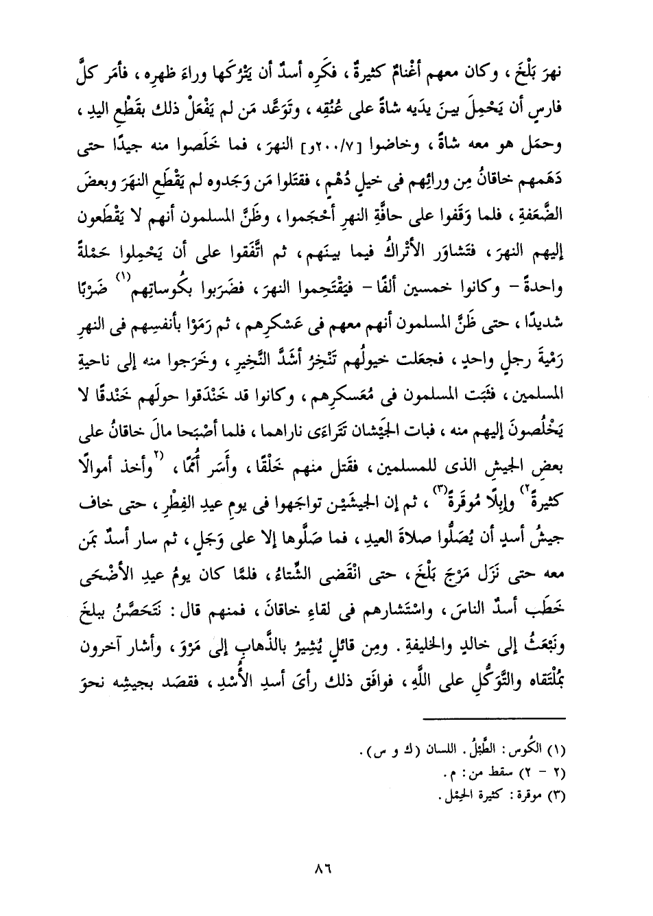 نَهْرَ بَلْخَ، وَكَانَ مَعَهُمْ أَغْنَامٌ كَثِيرَةٌ، فَكَرِهَ أَسَدٌ أَنْ يَتْرُكَهَا وَرَاءَ ظَهْرِهِ، فَأَمَرَ كُلَّ فَارِسٍ أَنْ يَحْمِلَ بَيْنَ يَدَيْهِ شَاةً عَلَى عُنُقِهِ، وَتَوعَّدَ مَنْ لَمْ يَفْعَلْ ذَلِكَ بِقَطْعِ الْيَدِ، وَحَمَلَ هُوَ مَعَهُ شَاةً، وَخَاضُوا النَّهْرَ، فَمَا خَلَصُوا مِنْهُ جِيدًا حَتَّى دَهَمَهُمْ خَاقَانُ مِنْ وَرَائِهِمْ فِي خَيْلٍ دُهْمٍ، فَقَتَلُوا مَنْ وَجَدُوهُ لَمْ يَقْطَعِ النَّهْرَ وَبَعْضَ الضَّعْفَةِ، فَلَمَّا وَقَفُوا عَلَى حَافَّةِ النَّهْرِ أَحْجَمُوا، وَظَنَّ الْمُسْلِمُونَ أَنَّهُمْ لَا يَقْطَعُونَ إِلَيْهِمُ النَّهْرَ، فَتَشَاوَرَ الْأَتْرَاكُ فِيمَا بَيْنَهُمْ، ثُمَّ اتَّفَقُوا عَلَى أَنْ يَحْمِلُوا حَمْلَةً وَاحِدَةً - وَكَانُوا خَمْسِينَ أَلْفًا - فَيَقْتَحِمُوا النَّهْرَ، فَضَرَبُوا بِكُوسَاتِهِمْ ضَرْبًا شَدِيدًا، حَتَّى ظَنَّ الْمُسْلِمُونَ أَنَّهُمْ مَعَهُمْ فِي عَسْكَرِهِمْ، ثُمَّ رَمَوْا بِأَنْفُسِهِمْ فِي النَّهْرِ رَمْيَةَ رَجُلٍ وَاحِدٍ، فَجَعَلَتْ خُيُولُهُمْ تَنْخِرُ أَشَدَّ النَّخِيرِ، وَخَرَجُوا مِنْهُ إِلَى نَاحِيَةِ الْمُسْلِمِينَ، فَثَبَتَ الْمُسْلِمُونَ فِي مُعَسْكَرِهِمْ، وَكَانُوا قَدْ خَنْدَقُوا حَوْلَهُمْ خَنْدَقًا لَا يَخْلُصُونَ إِلَيْهِمْ مِنْهُ، فَبَاتَ الْجَيْشَانِ تَتَرَاءَى نَارَاهُمَا، فَلَمَّا أَصْبَحَا مَالَ خَاقَانُ عَلَى بَعْضِ الْجَيْشِ الَّذِي لِلْمُسْلِمِينَ، فَقَتَلَ مِنْهُمْ خَلْقًا، وَأَسَرَ أُمَمًا، وَأَخَذَ أَمْوَالًا كَثِيرَةً وَإِبِلًا مُوْقَرَةً، ثُمَّ إِنَّ الْجَيْشَيْنِ تَوَاجَهُوا فِي يَوْمِ عِيدِ الْفِطْرِ، حَتَّى خَافَ جَيْشُ أَسَدٍ أَنْ يُصَلُّوا صَلَاةَ الْعِيدِ، فَمَا صَلَّوْهَا إِلَّا عَلَى وَجَلٍ، ثُمَّ سَارَ أَسَدٌ بِمَنْ مَعَهُ حَتَّى نَزَلَ مَرْجَ بَلْخَ، حَتَّى انْقَضَى الشِّتَاءُ، فَلَمَّا كَانَ يَوْمَ عِيدِ الْأَضْحَى خَطَبَ أَسَدٌ النَّاسَ، وَاسْتَشَارَهُمْ فِي لِقَاءِ خَاقَانَ، فَمِنْهُمْ مَنْ قَالَ: نَتَحَصَّنُ بِبَلْخَ وَنَبْعَثُ إِلَى خَالِدٍ وَالْخَلِيفَةِ. وَمِنْ قَائِلٍ يُشِيرُ بِالذَّهَابِ إِلَى مَرْوَ، وَأَشَارَ آخَرُونَ بِمُلْتَقَاهُ وَالتَّوَكُّلِ عَلَى اللَّهِ، فَوَافَقَ ذَلِكَ رَأْيُ أَسَدِ الْأُسْدِ، فَقَصَدَ بِجَيْشِهِ نَحْوَ