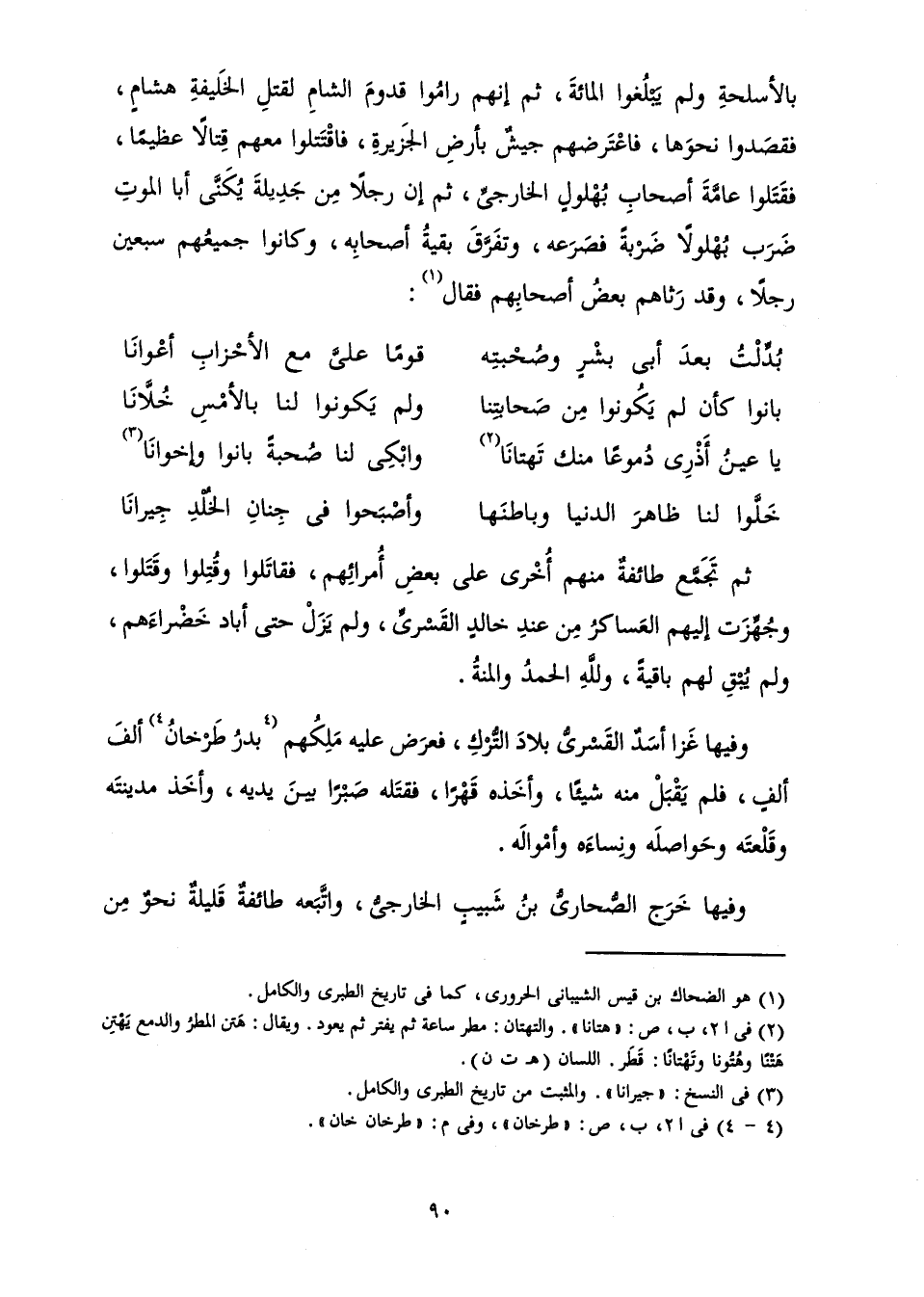بِالْأَسْلِحَةِ وَلَمْ يَبْلُغُوا الْمِائَةَ، ثُمَّ إِنَّهُمْ رَامُوا قُدُومَ الشَّامِ لِقَتْلِ الْخَلِيفَةِ هِشَامٍ فَقَصَدُوا نَحْوَهَا، فَاعْتَرَضَهُمْ جَيْشٌ بِأَرْضِ الْجَزِيرَةِ فَاقْتَتَلُوا مَعَهُمْ قِتَالًا عَظِيمًا، فَقَتَلُوا عَامَّةَ أَصْحَابِ بُهْلُولٍ الْخَارِجِيِّ ثُمَّ إِنَّ رَجُلًا مِنْ جَدِيلَةَ يُكَنَّى أَبَا الْمَوْتِ ضَرَبَ بُهْلُولًا ضَرْبَةً فَصَرَعَهُ، وَتَفَرَّقَ بَقِيَّةُ أَصْحَابِهِ، وَكَانُوا جَمِيعُهُمْ سَبْعِينَ رَجُلًا، وَقَدْ رَثَاهُمْ بَعْضُ أَصْحَابِهِمْ فَقَالَ: