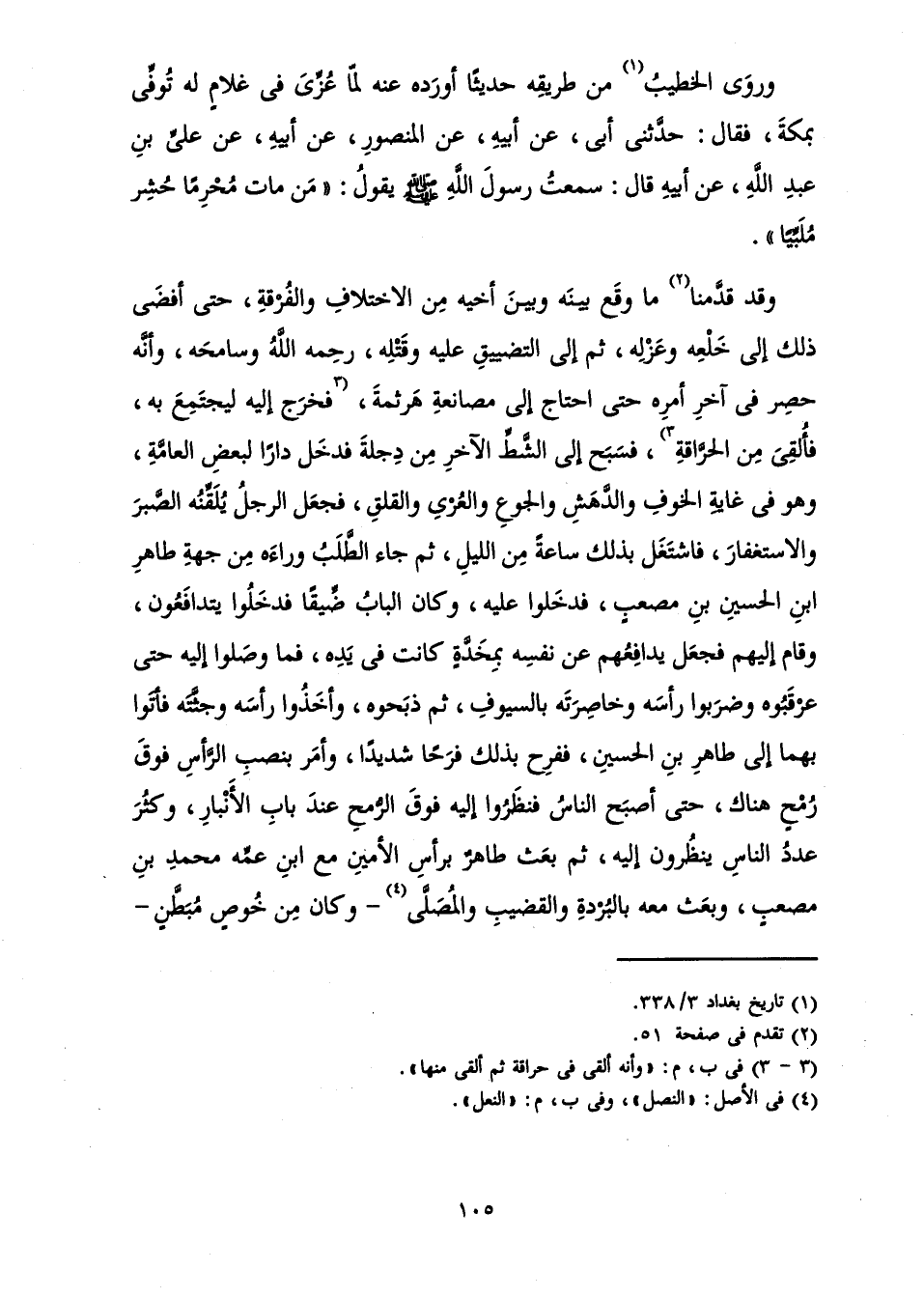 وَقَدْ قَدَّمْنَا مَا وَقَعَ بَيْنَهُ وَبَيْنَ أَخِيهِ مِنَ الِاخْتِلَافِ وَالْفُرْقَةِ حَتَّى أَفْضَى ذَلِكَ إِلَى خَلْعِهِ وَعَزْلِهِ، ثُمَّ إِلَى التَّضْيِيقِ عَلَيْهِ وَقَتْلِهِ، رَحِمَهُ اللَّهُ وَسَامَحَهُ، وَأَنَّهُ حُصِرَ فِي آخِرِ أَمْرِهِ حَتَّى احْتَاجَ إِلَى مُصَانَعَةِ هَرْثَمَةَ، فَخَرَجَ إِلَيْهِ لِيَجْتَمِعَ بِهِ، فَأُلْقِيَ مِنَ الْحَرَّاقَةِ، فَسَبَحَ إِلَى الشَّطِّ الْآخَرِ مِنْ دِجْلَةَ فَدَخَلَ دَارًا لِبَعْضِ الْعَامَّةِ، وَهُوَ فِي غَايَةِ الْخَوْفِ وَالدَّهَشِ وَالْجُوعِ وَالْعُرْيِ وَالْقَلَقِ، فَجَعَلَ الرَّجُلُ يُلَقِّنُهُ الصَّبْرَ وَالِاسْتِغْفَارَ فَاشْتَغَلَ بِذَلِكَ سَاعَةً مِنَ اللَّيْلِ، ثُمَّ جَاءَ الطَّلَبُ وَرَاءَهُ مِنْ جِهَةِ طَاهِرِ بْنِ الْحُسَيْنِ بْنِ مُصْعَبٍ، فَدَخَلُوا عَلَيْهِ، وَكَانَ الْبَابُ ضَيِّقًا فَدَخَلُوا عَلَيْهِ يَتَدَافَعُونَ، وَقَامَ إِلَيْهِمْ فَجَعَلَ يُدَافِعُهُمْ عَنْ نَفْسِهِ بِمِخَدَّةٍ فِي يَدِهِ، فَمَا وَصَلُوا إِلَيْهِ حَتَّى عَرْقَبُوهُ وَضَرَبُوا رَأْسَهُ وَخَاصِرَتَهُ بِالسُّيُوفِ، ثُمَّ ذَبَحُوهُ، وَأَخَذُوا رَأْسَهُ وَجُثَّتَهُ فَأَتَوْا بِهِمَا طَاهِرَ بْنَ الْحُسَيْنِ فَفَرِحَ بِذَلِكَ فَرَحًا شَدِيدًا، وَأَمَرَ بِنَصْبِ الرَّأْسِ فَوْقَ رُمْحٍ هُنَاكَ، حَتَّى أَصْبَحَ النَّاسُ فَنَظَرُوا إِلَيْهِ فَوْقَ الرُّمْحِ عِنْدَ بَابِ الْأَنْبَارِ وَكَثُرَ عَدَدُ النَّاسِ يَنْظُرُونَ إِلَيْهِ، ثُمَّ بَعَثَ طَاهِرٌ بِرَأْسِ الْأَمِينِ مَعَ ابْنِ عَمِّهِ مُحَمَّدِ بْنِ مُصْعَبٍ، وَبَعَثَ مَعَهُ بِالْبُرْدَةِ وَالْقَضِيبِ وَالْمُصَلَّى وَكَانَ مِنْ خُوصٍ مُبَطَّنٍ