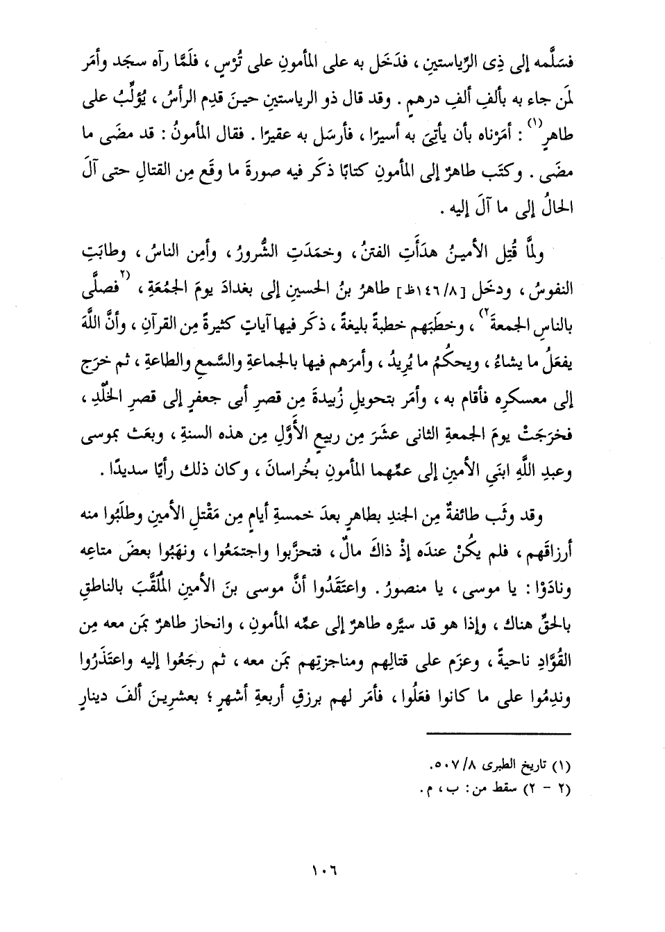 وَقَدْ وَثَبَ طَائِفَةٌ مِنَ الْجُنْدِ بِطَاهِرٍ بَعْدَ خَمْسَةِ أَيَّامٍ مِنْ مَقْتَلِ الْأَمِينِ وَطَلَبُوا مِنْهُ أَرْزَاقَهُمْ، فَلَمْ يَكُنْ عِنْدَهُ إِذْ ذَاكَ مَالٌ، فَتَحَزَّبُوا وَاجْتَمَعُوا، وَنَهَبُوا بَعْضَ مَتَاعِهِ وَنَادَوْا: يَا مُوسَى، يَا مَنْصُورُ. وَاعْتَقَدُوا أَنَّ مُوسَى بْنَ الْأَمِينِ الْمُلَقَّبَ بِالنَّاطِقِ بِالْحَقِّ هُنَاكَ، وَإِذَا هُوَ قَدْ سَيَّرَهُ طَاهِرٌ إِلَى عَمِّهِ الْمَأْمُونِ وَانْحَازَ طَاهِرٌ بِمَنْ مَعَهُ مِنَ الْقُوَّادِ نَاحِيَةً، وَعَزَمَ عَلَى قِتَالِهِمْ وَمُنَاجَزَتِهِمْ بِمَنْ مَعَهُ، ثُمَّ رَجَعُوا إِلَيْهِ، وَاعْتَذَرُوا، وَنَدِمُوا عَلَى مَا كَانُوا فَعَلُوا، فَأَمَرَ لَهُمْ بِرِزْقِ أَرْبَعَةِ أَشْهُرٍ؛ بِعِشْرِينَ أَلْفَ دِينَارٍ
