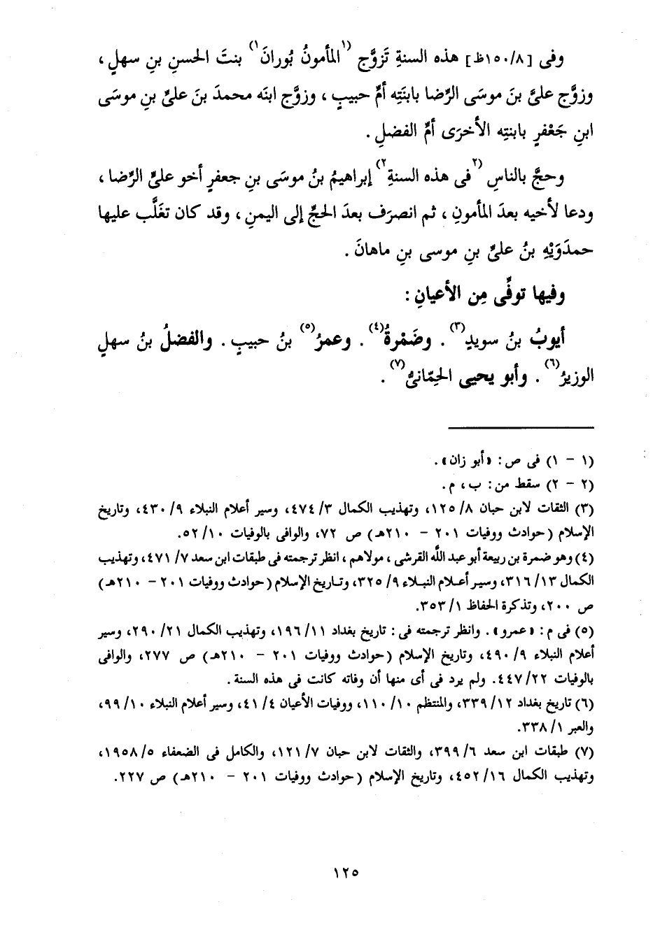 وَفِي هَذِهِ السَّنَةِ تَزَوَّجَ الْمَأْمُونُ بُورَانَ بِنْتَ الْحَسَنِ بْنِ سَهْلٍ، وَزَوَّجَ عَلِيَّ بْنَ مُوسَى الرِّضَا بِابْنَتِهِ أُمِّ حَبِيبٍ، وَزَوَّجَ ابْنَهُ مُحَمَّدَ بْنَ عَلِيِّ بْنِ مُوسَى بْنِ جَعْفَرٍ بِابْنَتِهِ الْأُخْرَى أُمِّ الْفَضْلِ.