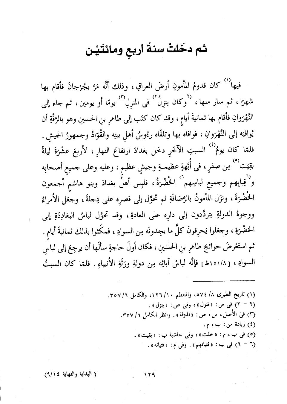 فِيهَا كَانَ قُدُومُ الْمَأْمُونِ أَرْضَ الْعِرَاقِ، وَذَلِكَ أَنَّهُ مَرَّ بِجُرْجَانَ فَأَقَامَ بِهَا شَهْرًا، ثُمَّ سَارَ مِنْهَا، وَكَانَ يَنْزِلُ فِي الْمَنْزِلِ يَوْمًا أَوْ يَوْمَيْنِ، ثُمَّ جَاءَ إِلَى النَّهْرَوانِ فَأَقَامَ بِهَا ثَمَانِيَةَ أَيَّامٍ، وَقَدْ كَانَ كَتَبَ إِلَى طَاهِرِ بْنِ الْحُسَيْنِ وَهُوَ بِالرَّقَّةِ أَنْ يُوَافِيَهُ إِلَى النَّهْرَوانِ فَوَافَاهُ بِهَا وَتَلَقَّاهُ رُءُوسُ أَهْلِ بَيْتِهِ وَالْقُوَّادُ، وَجُمْهُورُ الْجَيْشِ. فَلَمَّا كَانَ يَوْمُ السَّبْتِ الْآخَرِ دَخَلَ بَغْدَادَ ارْتِفَاعَ النَّهَارِ، لِأَرْبَعَ عَشْرَةَ لَيْلَةً بَقِيَتْ مِنْ صَفَرٍ، فِي أُبَّهَةٍ عَظِيمَةٍ وَجَيْشٍ عَظِيمٍ، وَعَلَيْهِ وَعَلَى جَمِيعِ أَصْحَابِهِ وَقُبَابِهِمْ وَجَمِيعِ لِبَاسِهِمُ الْخُضْرَةَ فَلَبِسَ أَهْلُ بَغْدَادَ وَبَنُو هَاشِمٍ أَجْمَعُونَ الْخُضْرَةَ، وَنَزَلَ الْمَأْمُونُ بِالرُّصَافَةِ ثُمَّ تَحَوَّلَ إِلَى قَصْرِهِ عَلَى دِجْلَةَ، وَجَعَلَ الْأُمَرَاءُ، وَوُجُوهُ الدَّوْلَةِ يَتَرَدَّدُونَ إِلَى دَارِهِ عَلَى الْعَادَةِ، وَقَدْ تَحَوَّلَ لِبَاسُ الْبَغَادِدَةِ إِلَى الْخُضْرَةِ، وَجَعَلُوا يَحْرِقُونَ كُلَّ مَا يَجِدُونَهُ مِنَ السَّوَادِ فَمَكَثُوا بِذَلِكَ ثَمَانِيَةَ أَيَّامٍ. ثُمَّ اسْتَعْرَضَ حَوَائِجَ طَاهِرِ بْنِ الْحُسَيْنِ فَكَانَ أَوَّلَ حَاجَةٍ سَأَلَهَا أَنْ يَرْجِعَ إِلَى لِبَاسِ السَّوَادِ فَإِنَّهُ لِبَاسُ آبَائِهِ مِنْ دَوْلَةِ وَرَثَةِ الْأَنْبِيَاءِ. فَلَمَّا كَانَ السَّبْتُ