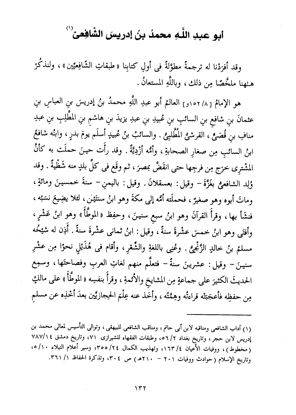 هُوَ الْإِمَامُ الْعَالِمُ أَبُو عَبْدِ اللَّهِ مُحَمَّدُ بْنُ إِدْرِيسَ بْنِ الْعَبَّاسِ بْنِ عُثْمَانَ بْنِ شَافِعِ بْنِ السَّائِبِ بْنِ عُبَيْدِ بْنِ عَبْدِ يَزِيدَ بْنِ هَاشِمِ بْنِ الْمُطَّلِبِ بْنِ عَبْدِ مَنَافِ بْنِ قُصَّيٍّ، الْقُرَشِيُّ الْمُطَّلِبيُّ، وَالسَّائِبُ بْنُ عُبَيْدٍ أَسْلَمَ يَوْمَ بَدْرٍ وَابْنُهُ شَافِعُ بْنُ السَّائِبِ مِنْ صِغَارِ الصَّحَابَةِ، وَأُمُّهُ أَزْدِيَّةٌ. وَقَدْ رَأَتْ حِينَ حَمَلَتْ بِهِ كَأَنَّ الْمُشْتَرِيَ خَرَجَ مِنْ فَرْجِهَا حَتَّى انْقَضَّ بِمِصْرَ، ثُمَّ وَقَعَ فِي كُلِّ بَلَدٍ مِنْهُ شَظِيَّةٌ. وَقَدْ وُلِدَ الشَّافِعِيُّ بِغَزَّةَ، وَقِيلَ: بِعَسْقَلَانَ. وَقِيلَ: بِالْيَمَنِ سَنَةَ خَمْسِينَ وَمِائَةٍ، وَمَاتَ أَبُوهُ وَهُوَ صَغِيرٌ، فَحَمَلَتْهُ أُمُّهُ إِلَى مَكَّةَ وَهُوَ ابْنُ سَنَتَيْنِ، لِئَلَّا يَضِيعَ نَسَبُهُ، فَنَشَأَ بِهَا، وَقَرَأَ الْقُرْآنَ وَهُوَ ابْنُ سبْعِ سِنِينَ، وَحَفِظَ " " الْمُوَطَّأَ " " وَهُوَ ابْنُ عَشْرٍ، وَأَفْتَى وَهُوَ ابْنُ خَمْسَ عَشْرَةَ سَنَةً، وَقِيلَ: ابْنُ ثَمَانِي عَشْرَةَ سَنَةً. أَذِنَ لَهُ شَيْخُهُ مُسْلِمُ بْنُ خَالِدٍ الزَّنْجِيُّ. وَعُنِيَ بِاللُّغَةِ وَالشِّعْرِ، وَأَقَامَ فِي هُذَيْلٍ نَحْوًا مِنْ عَشْرِ سِنِينَ، وَقِيلَ: عِشْرِينَ سَنَةً، فَتَعَلَّمَ مِنْهُمْ لُغَاتِ الْعَرَبِ وَفَصَاحَتَهَا، وَسَمِعَ الْحَدِيثَ الْكَثِيرَ عَلَى جَمَاعَةٍ مِنَ الْمَشَايِخِ وَالْأَئِمَّةِ، وَقَرَأَ بِنَفْسِهِ " " الْمُوَطَّأَ " " عَلَى مَالِكٍ مِنْ حِفْظِهِ فَأَعْجَبَتْهُ قِرَاءَتُهُ وَهِمَّتُهُ، وَأُخِذَ عَنْهُ عِلْمُ الْحِجَازِيِّينَ بَعْدَ أَخْذِهِ، عَنْ مُسْلِمِ
