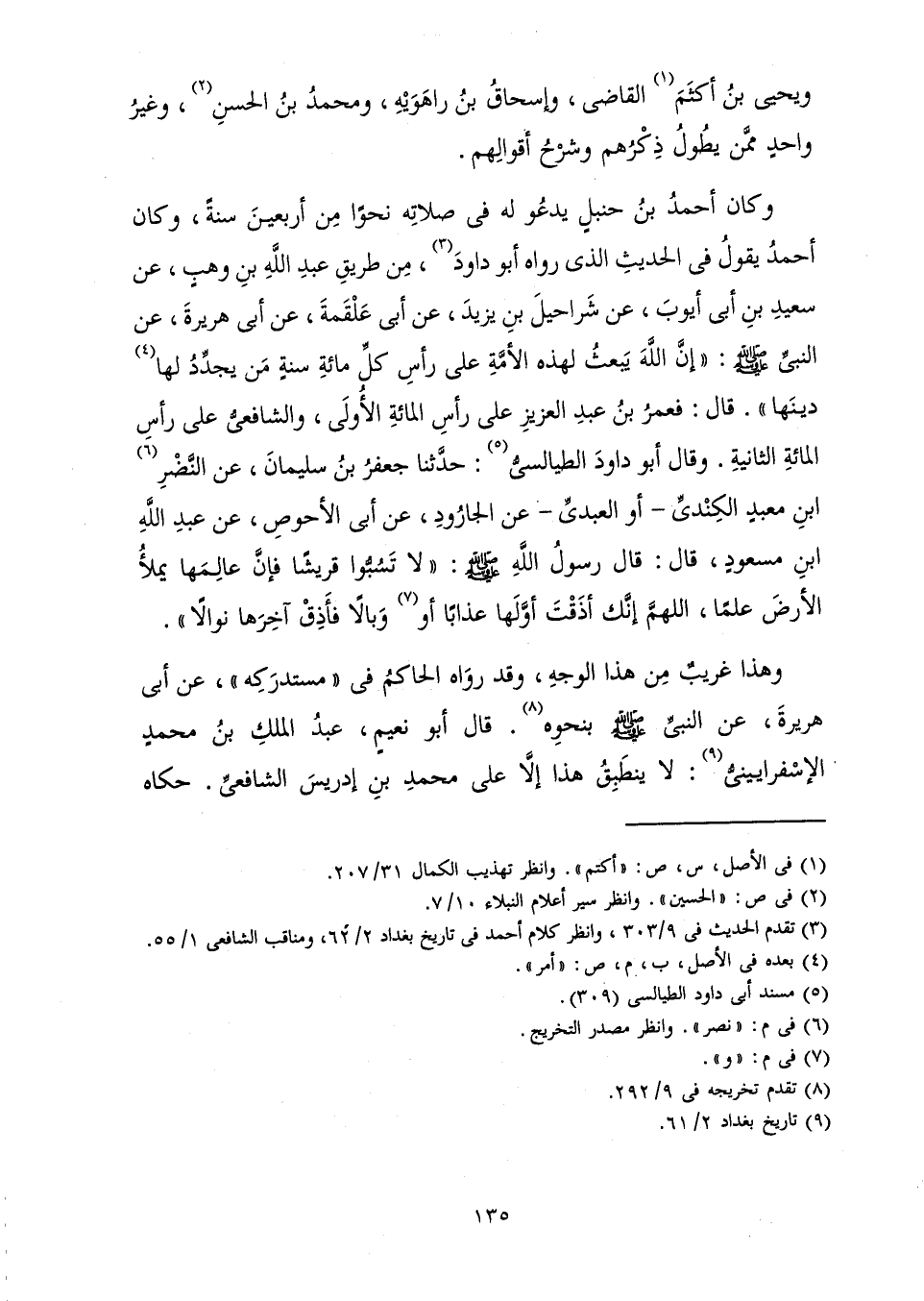 وَكَانَ أَحْمَدُ بْنُ حَنْبَلٍ يَدْعُو لَهُ فِي صَلَاتِهِ نَحْوًا مِنْ أَرْبَعِينَ سَنَةً، وَكَانَ أَحْمَدُ يَقُولُ فِي الْحَدِيثِ الَّذِي رَوَاهُ أَبُو دَاوُدَ، مِنْ طَرِيقِ عَبْدِ اللَّهِ بْنِ وَهْبٍ، عَنْ سَعِيدِ بْنِ أَبِي أَيُّوبَ، عَنْ شَرَاحِيلَ بْنِ يَزِيدَ، عَنْ أَبِي عَلْقَمَةَ، عَنْ أَبِي هُرَيْرَةَ، عَنِ النَّبِيِّ صَلَّى اللَّهُ عَلَيْهِ وَسَلَّمَ: «إِنَّ اللَّهَ يَبْعَثُ لِهَذِهِ الْأُمَّةِ عَلَى رَأْسِ كُلِّ مِائَةِ سَنَةٍ مَنْ يُجَدِّدُ لَهَا دِينَهَا» قَالَ: فَعُمَرُ بْنُ عَبْدِ الْعَزِيزِ عَلَى رَأْسِ الْمِائَةِ الْأُولَى، وَالشَّافِعِيُّ عَلَى رَأْسِ الْمِائَةِ الثَّانِيَةِ. وَقَالَ أَبُو دَاوُدَ الطَّيَالِسِيُّ: حَدَّثَنَا جَعْفَرُ بْنُ سُلَيْمَانَ، عَنِ النَّضْرِ بْنِ مَعْبَدٍ الْكِنْدِيِّ أَوِ الْعَبْدِيِّ، عَنِ الْجَارُودِ، عَنْ أَبِي الْأَحْوَصِ عَنْ عَبْدِ اللَّهِ بْنِ مَسْعُودٍ قَالَ: قَالَ رَسُولُ اللَّهِ صَلَّى اللَّهُ عَلَيْهِ وَسَلَّمَ: «لَا تَسُبُّوا قُرَيْشًا فَإِنَّ عَالِمَهَا يَمْلَأُ الْأَرْضَ عِلْمًا، اللَّهُمَّ إِنَّكَ أَذَقْتَ أَوَّلَهَا عَذَابًا - أَوْ وَبَالًا - فَأَذِقْ آخِرَهَا نَوَالًا» .