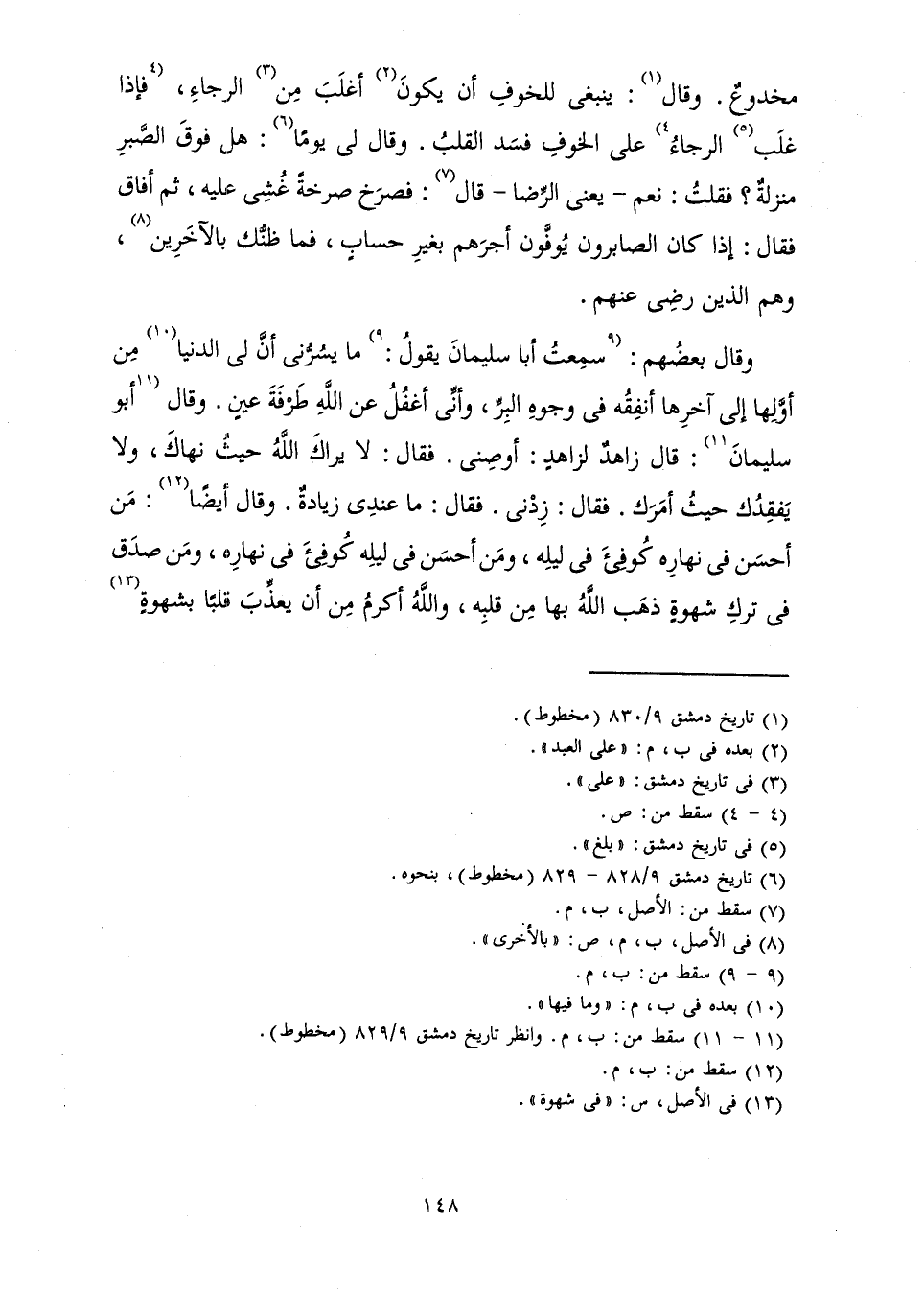 مَخْدُوعٌ. وَقَالَ: يَنْبَغِي لِلْخَوْفِ أَنْ يَكُونَ أَغْلَبَ مِنَ الرَّجَاءِ، فَإِذَا غَلَبَ الرَّجَاءُ عَلَى الْخَوْفِ فَسَدَ الْقَلْبُ. وَقَالَ لِي يَوْمًا: هَلْ فَوْقَ الصَّبْرِ مَنْزِلَةٌ؟ فَقُلْتُ: نَعَمْ. يَعْنِي الرِّضَا. قَالَ: فَصَرَخَ صَرْخَةً غُشِيَ عَلَيْهِ، ثُمَّ أَفَاقَ فَقَالَ: إِذَا كَانَ الصَّابِرُونَ يُوفَّوْنَ أَجْرَهُمْ بِغَيْرِ حِسَابٍ، فَمَا ظَنُّكَ بِالْآخَرِينَ، وَهُمُ الَّذِينَ رَضِيَ عَنْهُمْ.