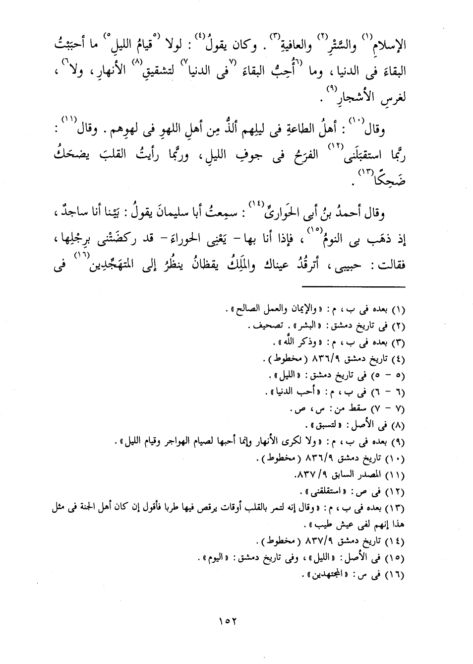 الْإِسْلَامِ وَالسَّتْرِ وَالْعَافِيَةِ. وَكَانَ يَقُولُ: لَوْلَا قِيَامُ اللَّيْلِ مَا أَحْبَبْتُ الْبَقَاءَ فِي الدُّنْيَا، وَمَا أُحِبُّ الْبَقَاءَ فِي الدُّنْيَا لِتَشْقِيقِ الْأَنْهَارِ وَلَا لِغَرْسِ الْأَشْجَارِ.
